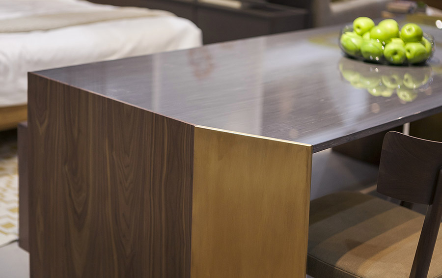 โต๊ะกินข้าดีไซน์ทันสมัย โดดเด่นด้วยท็อปที่ผลิตจากวัสดุ GEOLUXE Pyrolithic Stone ที่มีให้เลือกหลากหลายสีเฉดในโทนสีเทาดำ กับฐานและขาไม้ธรรมชาติอย่าง ไม้วอลนัท ปิดผิวข้างโต๊ะด้วยแผ่นทองเหลืองแผ่นใหญ่ มีความเฉพาะตัวในแบบทันสมัยด้วยรูปทรงป้านเข้ามุมของขอบโต๊ะ มาพร้อมเก้าอี้โครงไม้พร้อมพนักพิงและเบาะนั่ง
