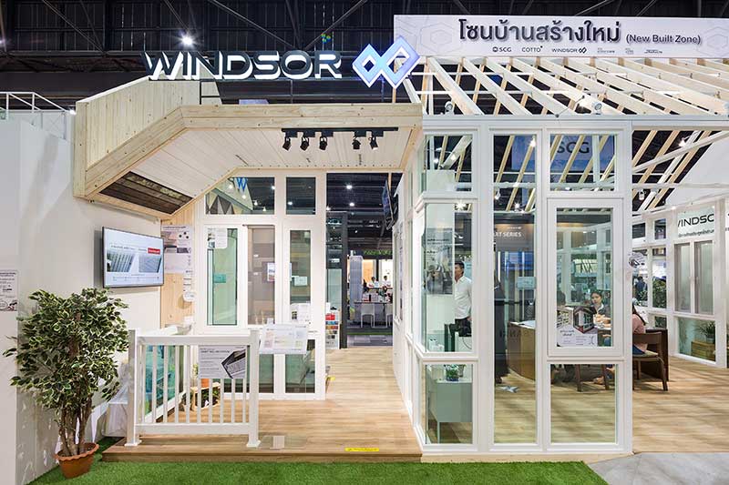 ปีนี้บูธ WINDSOR ตั้งอยู่ในบ้านใหญ่ของ SCG ตั้งอยู่โซนวัสดุก่อสร้างและตกแต่ง ใจกลางพื้นที่ของงานบ้านและสวนแฟร์ก็ว่าได้ ภายในบูธแบ่งฟังก์ชั่นออกเป็น 2 ส่วนได้อย่างน่าสนใจ ได้แก่โซนบ้านสร้างใหม่ (New Build Zone) และโซนต่อเติม/ปรับปรุงบ้าน (Renovate Zone)
