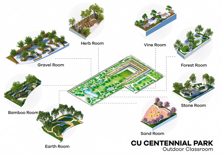 หลังจากคุณกชกรได้ศึกษาหาข้อมูลงานดีไซน์โปรเจ็กต์สวนสาธารณะในพื้นที่เมืองมาพอสมควร ทำให้ได้ข้อสรุปว่า “จริง ๆ แล้วพื้นที่ของสวนที่สำคัญคือพื้นที่ขอบ แล้วปล่อยให้ตรงกลางว่างเพื่อให้เกิดความยืดหยุ่นสูงสุด” เป็นที่มาให้สวนแห่งนี้มีสนามหญ้าโล่งกว้างอยู่ตรงกลาง พร้อมปรับเปลี่ยนฟังก์ชันไปตามรูปแบบการใช้งาน แล้วออกแบบพื้นที่ขอบสวนเป็นห้องเรียนกลางแจ้งขนาดเล็กจำนวน 8 ห้องที่แตกต่างกันออกไปตามการเรียนรู้ ผ่านแนวคิดการออกแบบให้เป็นป่าในภาษาที่โมเดิร์น เปลี่ยนให้พื้นที่บริเวณขอบสวนเกิดความเคลื่อนไหวคึกครื้น ทั้งยังเป็นการแก้ปัญหาเรื่องความปลอดภัยที่มักเกิดในพื้นที่มุมอับ หรือริมรั้วที่เข้าไม่ถึง
