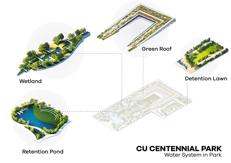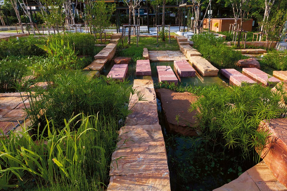 –CONSTRUCTED WETLAND หรือพื้นที่ชุ่มน้ำ แบ่งเป็น 2 ฝั่งขนานเป็นแนวยาว บริเวณกลางสวนใช้ลักษณะของพื้นที่ที่ลาดเอียงรับกับธรรมชาติของน้ำที่ไหลจากที่สูงลงสู่ที่ต่ำ ให้ไหลผ่านพืชชายน้ำ และพืชทนน้ำที่มีความสามารถในการดูดสารพิษและฟื้นฟูสภาพแวดล้อม (Phytoremediation) ของน้ำเสียที่มาจากอาคารในพื้นที่โครงการและพื้นที่ข้างเคียง ก่อนจะปล่อยลงสู่ RETENTION POND ด้านหน้า เป็นการสร้างระบบนิเวศและหมุนเวียนน้ำในโครงการได้อย่างสมบูรณ์