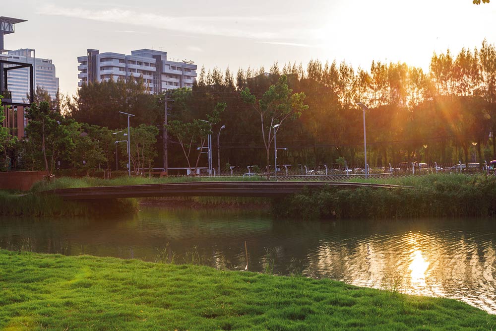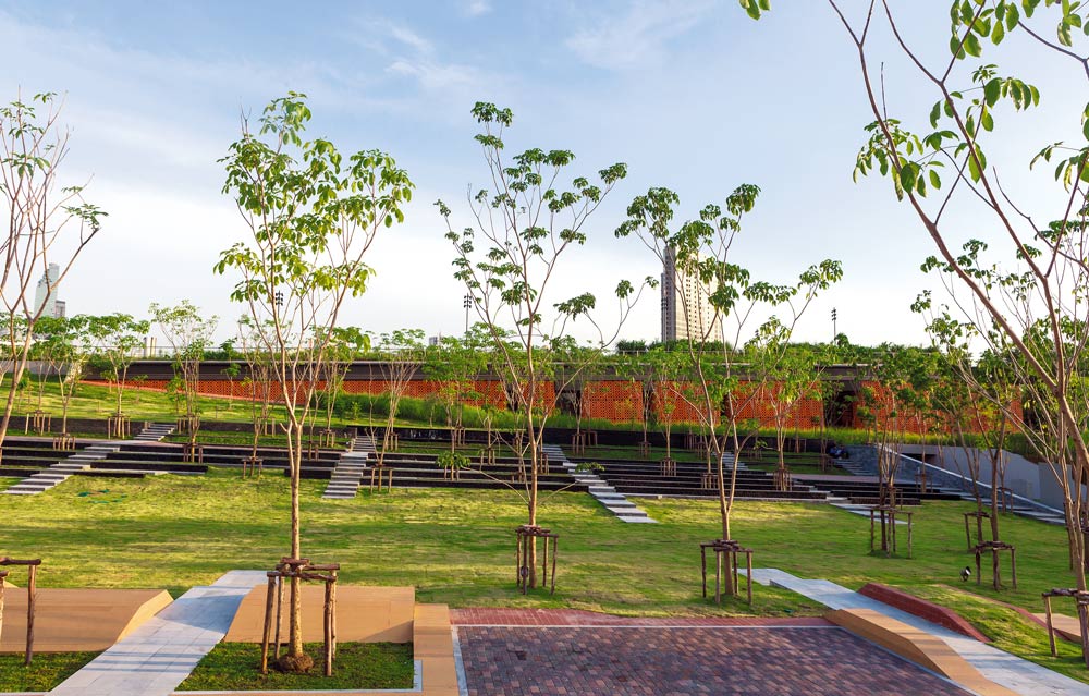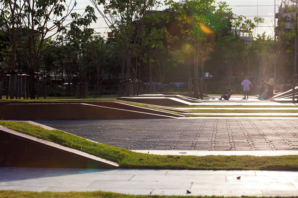 –DETENTION LAWN หรือพื้นที่หน่วงน้ำแบบแห้ง ในวันที่มีฝนตก สนามหญ้าผืนใหญ่ผืนนี้พร้อมโอบอุ้มน้ำฝนแล้วหน่วงน้ำเหล่านั้นไว้ในพื้นที่ ก่อนจะค่อย ๆ ซึมลงดินในวันธรรมดา ฝั่งหนึ่งจึงกลายเป็นพื้นที่วิ่งเล่นของเด็ก ๆ จากชุมชนข้างเคียง โดยมีสไลเดอร์ที่ลาดเอียงล้อกับสัณฐานของที่ดินให้เด็ก ๆ ได้เล่นสนุก อีกฝั่งแบ่งเป็นขั้นบันไดเสมือนแอมฟิเธียร์เตอร์ขนาดย่อมเรียงหน้าตลอดแนวสนามสำหรับนั่งพูดคุย พักผ่อน หรือทำกิจกรรมแบบกลุ่ม