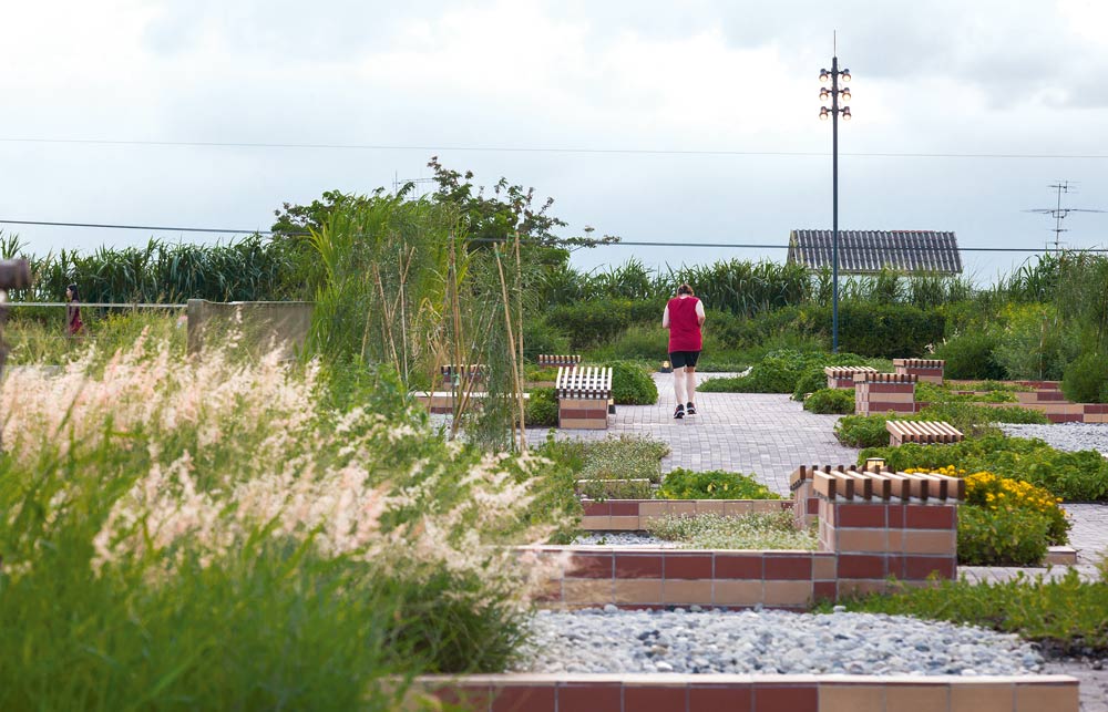 –GREEN ROOF หรือสวนหลังคา จากพื้นที่ที่ถูกยกตัวทีมภูมิสถาปนิกจึงได้สร้างพื้นที่สีเขียวให้ต่อเนื่องจากด้านล่างไปสู่ด้านบนอย่างแนบเนียน ด้วยอัตราส่วนความลาดเอียงตามมาตรฐานและสเกลใหญ่ ทำให้มองด้วยตาเปล่าอาจไม่ค่อยรู้สึกถึงระดับที่เปลี่ยนไปมากนัก สวนหลังคานี้นอกจากเติมเต็มพื้นที่สีเขียวบนผืนคอนกรีตขนาดใหญ่แล้ว ยังช่วยลดอุณภูมิภายในอาคารที่อยู่ข้างได้อย่างดี พรรณไม้ที่เลือกใช้ส่วนใหญ่เน้นปลูกไม้จำพวกวัชพืช เมื่อเมล็ดตกลงดินก็สามารถขยายพันธุ์ได้ด้วยตัวเอง ทั้งยังดูแลรักษาง่าย ทนแล้งได้ดี วัชพืชที่ขึ้นคละกันไปมาจึงกลายเป็นความงามแบบง่าย ๆ ที่ไม่ต้องดูแลมาก แถมยังสร้างความสวยงามไปตามฤดูกาลที่เปลี่ยนแปลงไปได้ด้วย