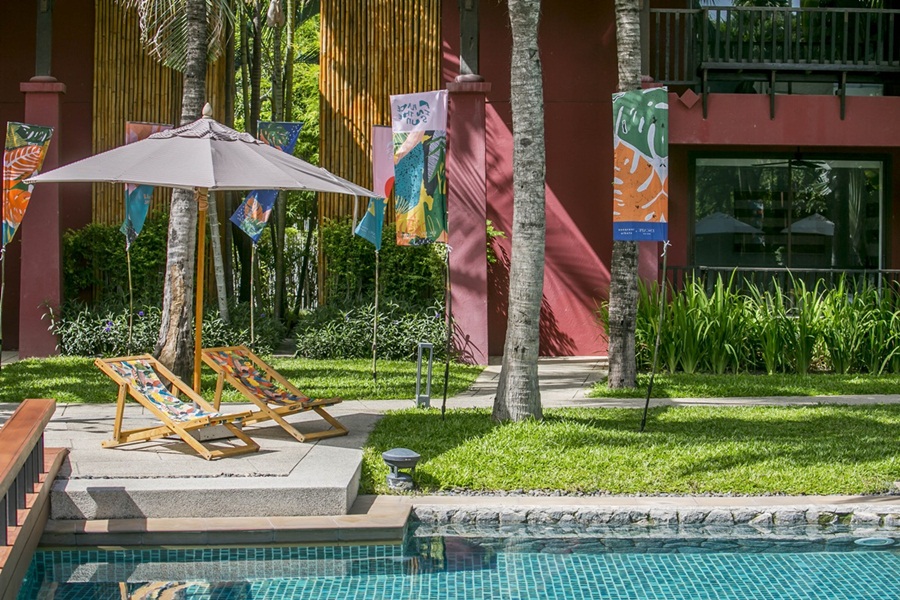 คุณพิมเล่าต่อไปอีกว่า “เนื่องจากโรงแรมมีพื้นที่ส่วนที่เป็นpublic area เยอะ และใช้สีแดงเป็นหลัก ซึ่งตรงกับคอนเซ็ปต์ที่คิดไว้ พิมเลยเลือกทำลายแพทเทิร์นที่ถนัด โดยดึงองค์ประกอบของทะเล และสีที่มาจากห้องพักทั้ง sea sand sun ของโรงแรมมาเป็น key visual หลักค่ะ ส่วนinstallation อื่นๆ เกิดจากการดึงองค์ประกอบในแพทเทิร์นมาขยายออกให้เป็นสามมิติและเล่นกับพื้นที่ต่างๆกันไป”