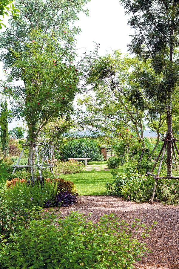 “สุดท้ายมุมหลังบ้านเน้นปลูกไม้ใบเส้นสายที่พลิ้วไหว เช่น หญ้าน้ำพุเป็นกลุ่มใหญ่เวลามองลงมาจากชั้นสองก็จะเวลาที่มีลมพัดมาใบของหญ้าก็จะพลิ้วไหวเหมือนเป็นคลื่นทะเลสวยงาม ได้บรรยากาศของทุ่งหญ้าที่ดูกว้างใหญ่ประกอบกับมุมมองจากด้านบนที่เห็นไร่มันสำประหลังและเทือกเขาที่ใกล้ออกไปสุดลูกหูลูกตา พรรณไม้ที่ใช้ก็มีเพียงไม่กี่ชนิดเพราะเน้นการดูแลง่ายเป็นหลัก แต่ยังคงอารมณ์และกลิ่นอายความเป็นสวนอังกฤษตามที่เจ้าของบ้านต้องการไว้อย่างครบถ้วนเลยครับ”นักจัดสวนกล่าว