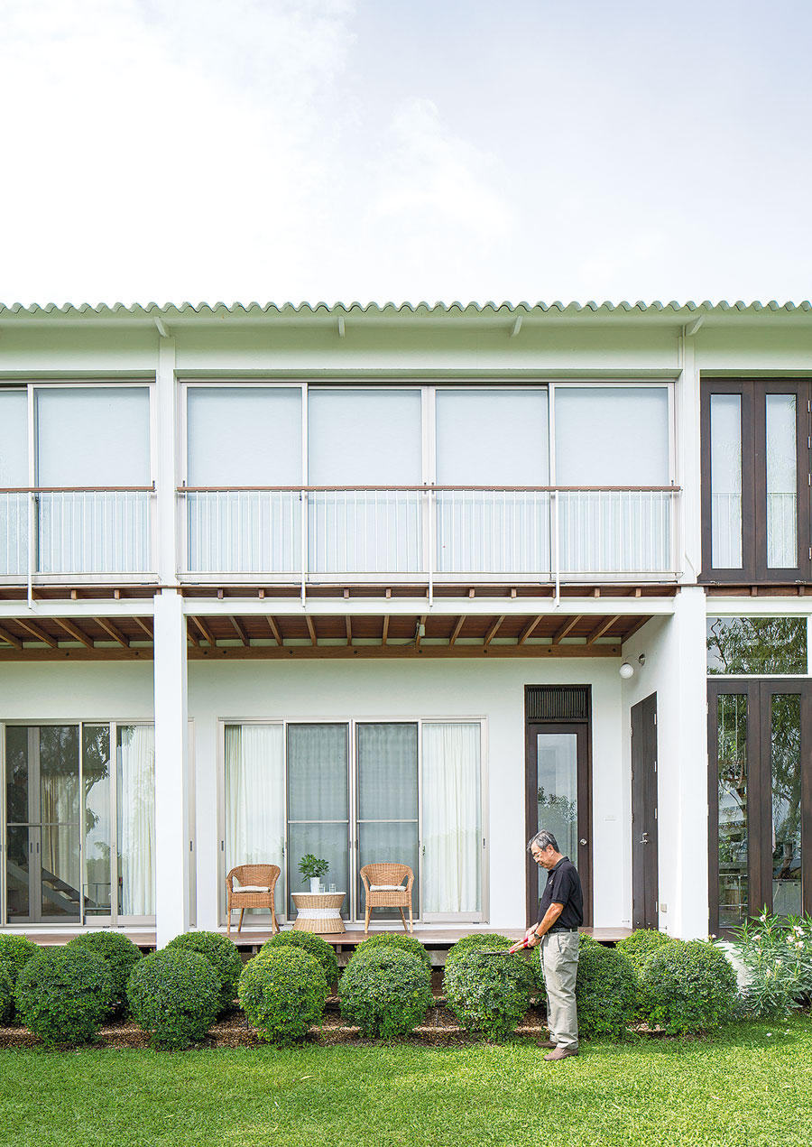 คุณศักดิ์เล่าว่า ครั้งแรกที่เข้ามาดูบ้านยังไม่ได้เริ่มทำอะไร พื้นที่เดิมเคยเป็นพื้นที่ทำการเษตรประมาณหนึ่งไร่ครึ่ง และเพื่อให้บ้านกับสวนเชื่อมโยงเป็นเรื่องราวเดียวกัน เจ้าของบ้านจึงอยากให้เราช่วยดูตำแหน่งเพื่อจะได้มองเห็นบรรยากาศของสวนได้โดยรอบ โจทย์ที่ได้รับคือต้องการความร่มรื่นแบบเดียวกับค่าเฟ่ที่จันทบุรีซึ่งเป็นสวนที่เราทำ และต้องการสวนที่มีกลิ่นอายความเป็นอังกฤษแบบมีองค์ประกอบน้อยชิ้น เรียบง่าย ดูแล้วสบายตา นี่คือโจทย์หลักๆที่ได้รับ เมื่อดูจากลักษณะบ้านที่เป็นเส้นตรงและยกพื้นสูง แต่มีหน้าต่างรอบบ้านจึงมองเห็นสวนได้จากทุกมุมมอง