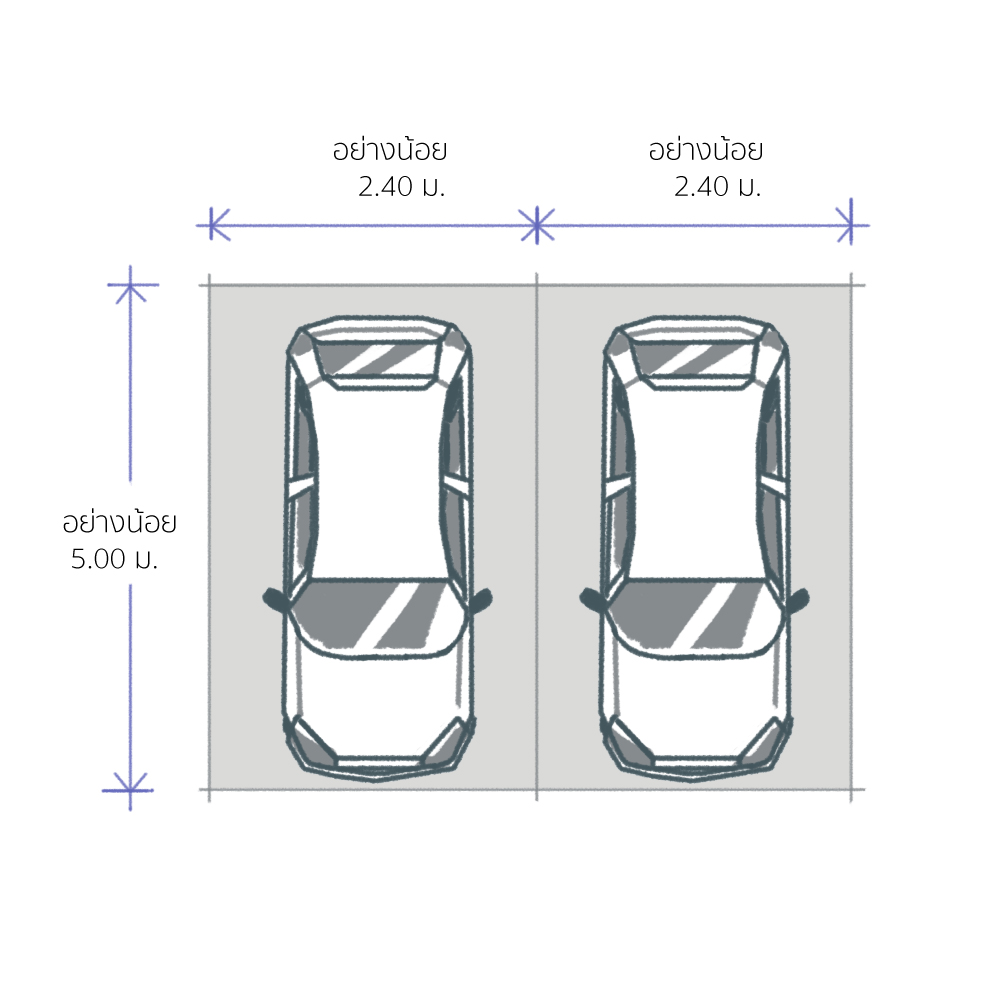 อย่างแรกคือ ต้องประมาณการพื้นที่ว่าจะจอดได้กี่คันและสะดวกหรือไม่ กล่าวคือ ที่จอดรถขนาดเล็กที่สุดสำหรับ 1 คันนั้นควรมีความกว้าง 2.40 เมตร และความยาว 5.00 เมตรครับ