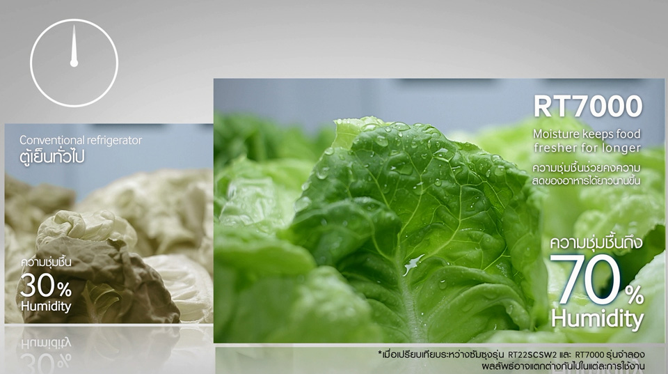 *อ้างอิงจากผลการทดลองภายในของซัมซุง เมื่อเปรียบเทียบจาก ตู้เย็นซัมซุงรุ่นทั่วไปกับ รุ่น RT7000 (จำลอง)