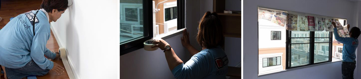 ต่อมาทีมช่างจะเริ่มทำการคลุมพื้นที่ของการทำงาน เพื่อสร้างความมั่นใจให้กับเจ้าของบ้านได้ว่า คุณจะได้สีที่สวยดั่งใจ พร้อมทั้งยังคงความสะอาดอย่างมืออาชีพ