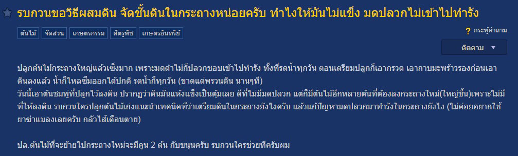 จากคำถาม : รบกวนขอวิธีผสมดิน จัดชั้นดินในกระถางหน่อยครับ ทำไงให้มันไม่แข็ง มดปลวกไม่เข้าไปทำรัง