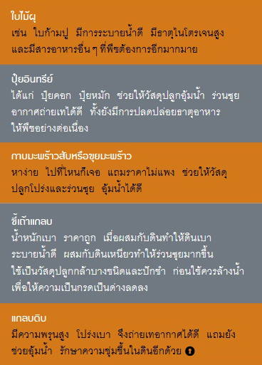 ลองดูสิว่าใกล้บ้านคุณมีแหล่งวัตถุดิบอะไรบ้างที่สามารถทำดินผสมใช้เองได้ ดินผสมที่ดีควรมีคุณสมบัติร่วนซุย โปร่ง อุ้มน้ำ และระบายอากาศได้ดี มีธาตุอาหารและจุลินทรีย์ที่เป็นประโยชน์กับต้นไม้ นอกจากดินแล้วยังมีส่วนผสมเพิ่ม โดยแบ่งคุณสมบัติเด่นๆ ของ “วัสดุปลูกแต่ละชนิด” ได้ ดังนี้