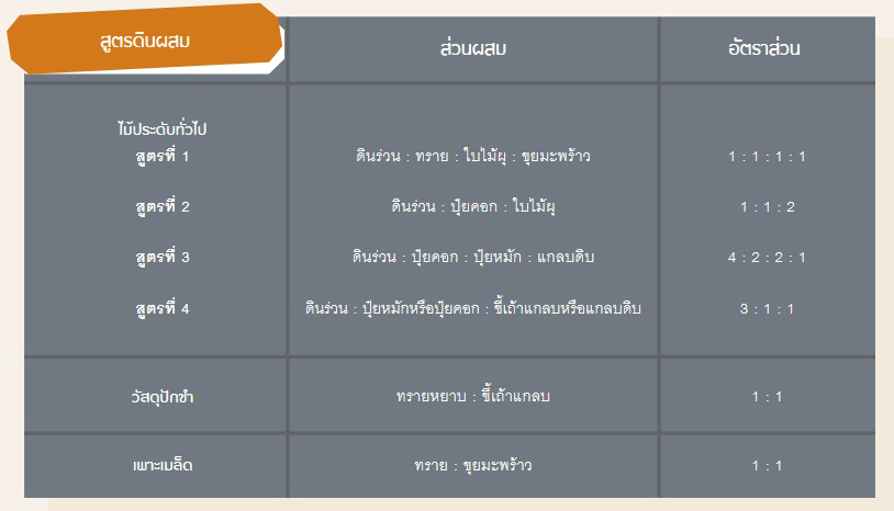 - ดินผสมทั่วไป เนื้อละเอียดร่วนซุย สีเข้ม ผสมปุ๋ยคอกช่วยเพิ่มอินทรีย์วัตถุ