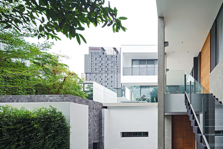 บันไดนอกบ้านขนาดสูงใหญ่นำพาเราขึ้นสู่พื้นที่อยู่อาศัยซึ่งเริ่มต้นจากชั้นสอง โดยมีสระว่ายน้ำขนาดยาวอยู่ด้านหน้าบ้านรูปตัวแอล (L) กลับด้าน ผนังรอบตัวบ้านฝั่งนี้จึงเน้นการเปิดโล่งด้วยกระจกทั้งหมด นอกจากจะได้แสงธรรมชาติเข้าสู่ภายในบ้านแล้ว ยังเชื่อมต่อมุมมองระหว่างห้องนั่งเล่นในบ้านกับสระว่ายน้ำไปพร้อมกัน