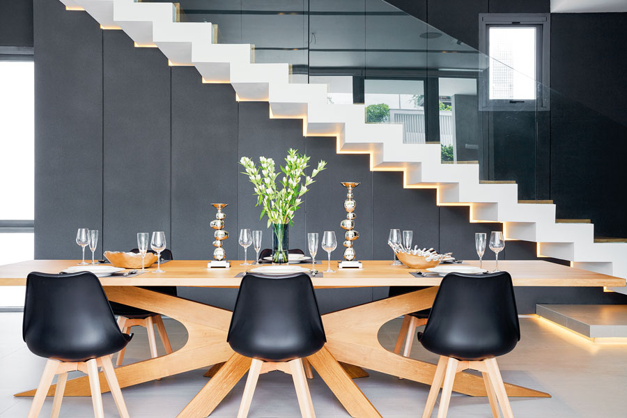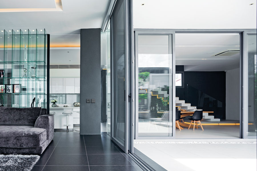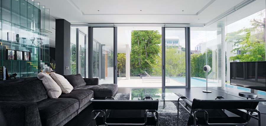 ความพิเศษที่โดดเด่นในบ้านสไตล์มินิมัลลิสม์นี้จึงอยู่ตรงเฟอร์นิเจอร์ชิ้นสวยซึ่งคุณโจ้เลือกสรรมาอย่างดี ไม่ว่าจะเป็นโต๊ะไม้สักในห้องรับประทานอาหารที่ถอดดีไซน์ส่วนขามาจากส่วนตกแต่งภายในเรือยอร์ช โซฟาขนาดใหญ่บุผ้าสีเทาเข้มในห้องนั่งเล่นซึ่งกลมกลืนไปกับพื้นกระเบื้องสีดำและเก้าอี้หนังสีดำWassily Chair ของ Marcel Breuer รวมถึงโต๊ะกลางฐานหินมีดีไซน์คลีบปลาฉลามติดกับท็อปกระจกใส ดูหรูหรารับกับชุดเครื่องเสียงเท่ๆของ Elipson จากฝรั่งเศสที่ซ่อนระบบและสายไฟไว้ใต้พื้นกระเบื้อง เมื่อนั่งอยู่ในห้องนี้จึงได้ทั้งความผ่อนคลายจากโซฟา ฟังก์ชันความบันเทิง และมุมมองที่โปร่งโล่งออกไปถึงสระว่ายน้ำด้านนอกผ่านผนังกระจกรอบด้าน