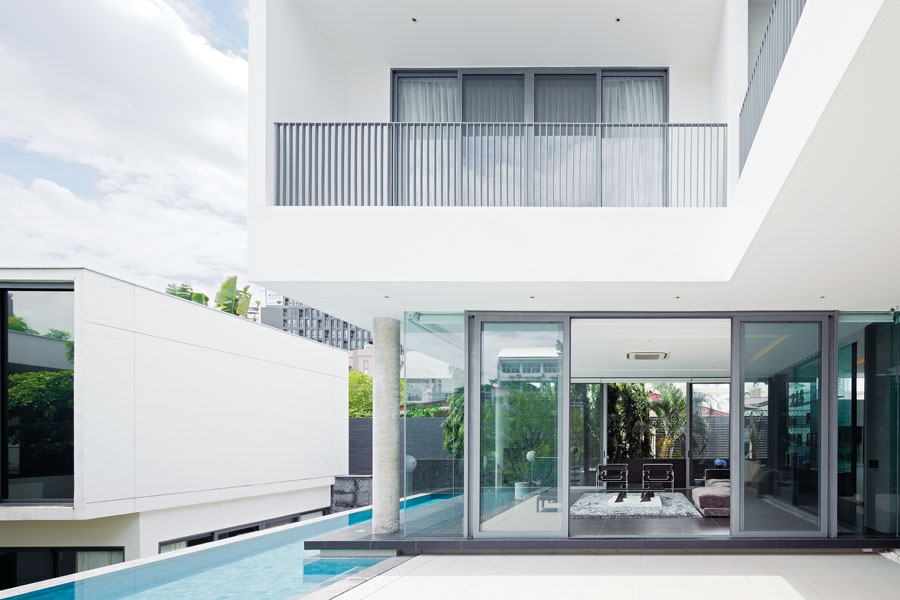 เมื่อมองจากรั้วหน้าบ้านเข้าไปแล้ว บ้านสีขาวหลังนี้ดูราวกับลอยอยู่สูงขึ้นไปบนฟ้า นั่นเพราะการออกแบบให้ชั้นล่างของบ้านเป็นพื้นที่จอดรถและบ่อปลา ดูไปคล้ายฟังก์ชันการใช้งานในลักษณะใต้ถุนสูงของบ้านไทยสมัยก่อน ต่างกันก็ตรงที่รูปทรงกล่องเหลี่ยมเป็นบ้านสไตล์โมเดิร์นที่ทันสมัยสุดๆ