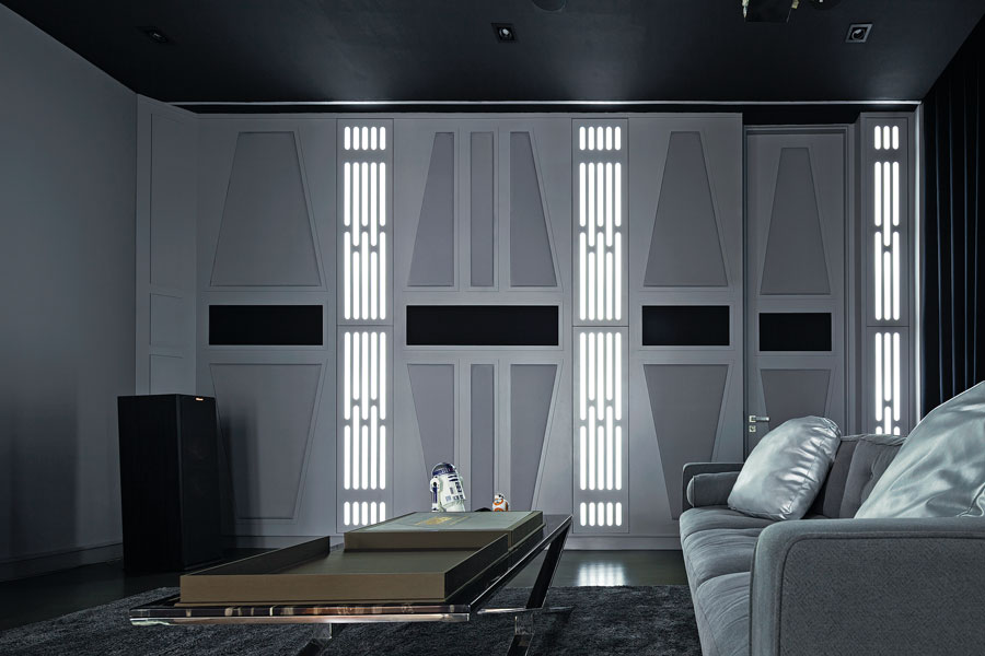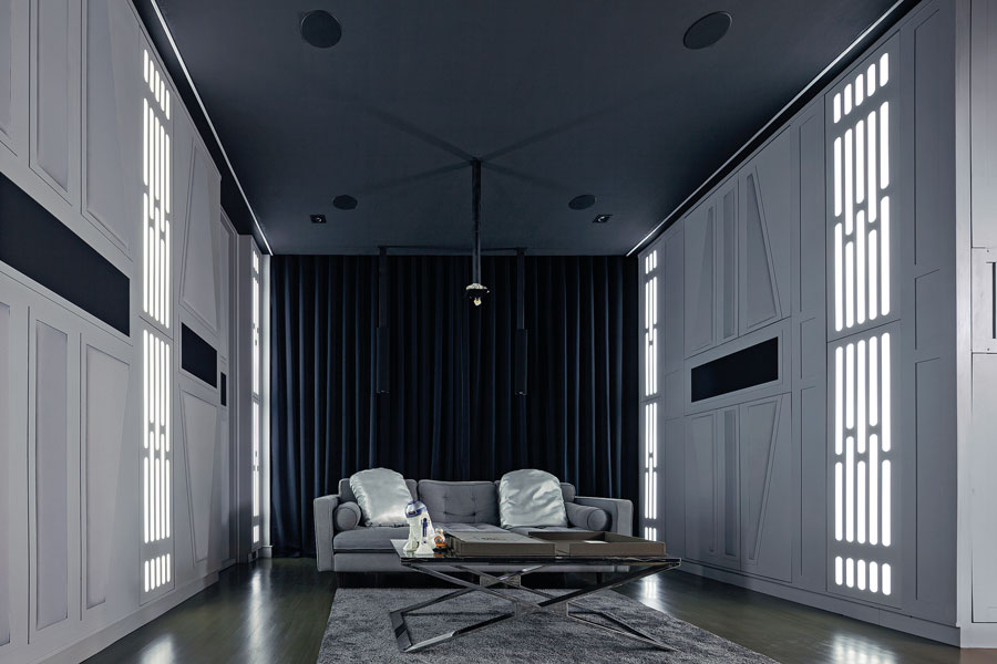 แม้แต่โฮมเธียเตอร์ของบ้านก็ไม่ธรรมดา เพราะคุณโจ้นำแรงบันดาลใจจากฉากในภาพยนตร์เรื่อง สตาร์วอร์สมาดีไซน์เป็นผนังตกแต่งของห้อง รวมถึงโทนสีและการออกแบบแสงไฟ กระทั่งรูปแบบของสวิตช์ไฟ เพื่อสร้างบรรยากาศให้เหมือนอยู่ภายในยานอวกาศแบบสตาร์วอร์สมากที่สุด