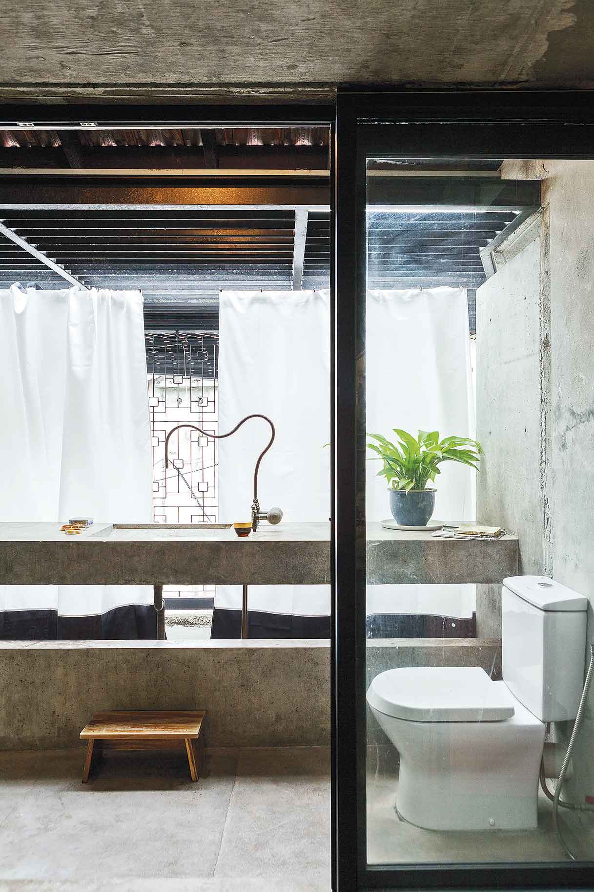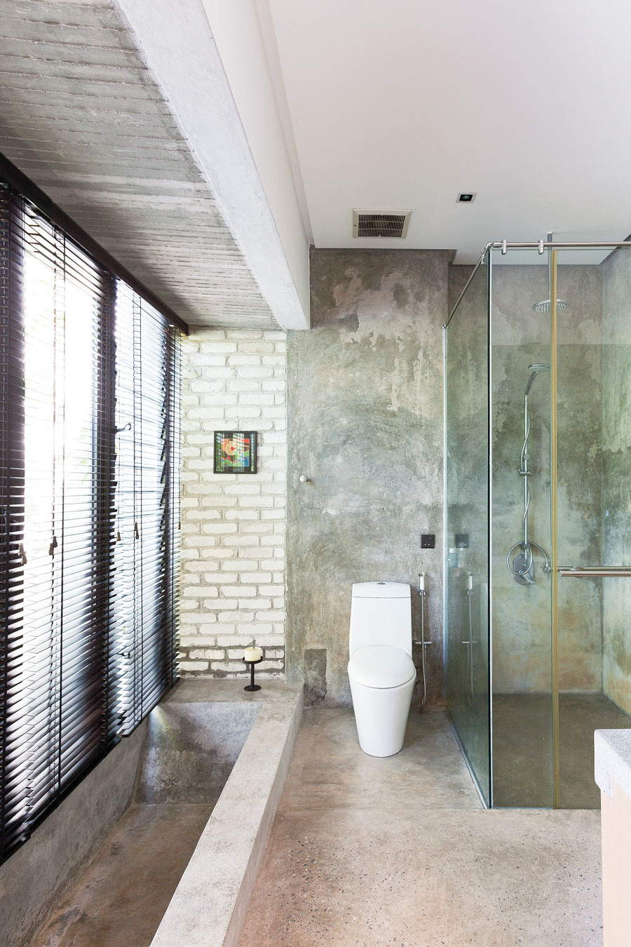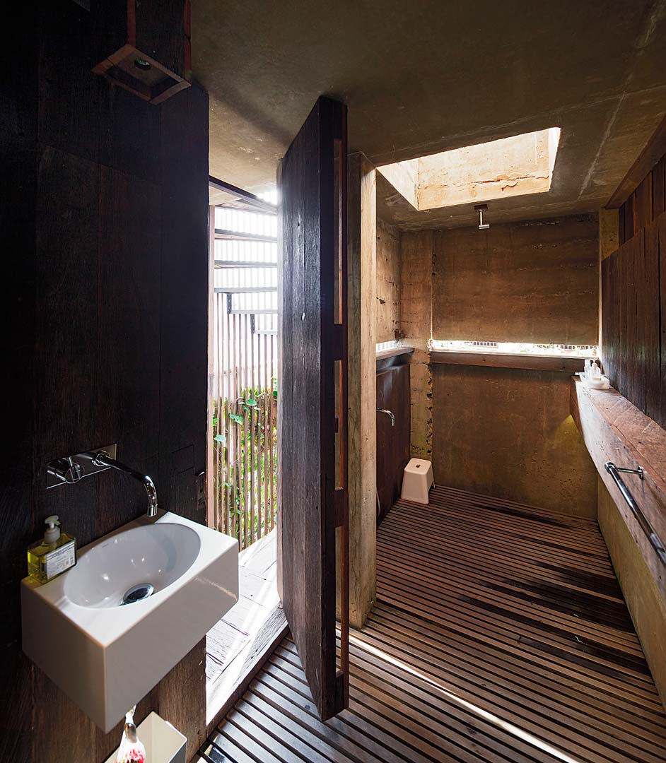 ห้องน้ำปูนเปลือยที่ผสานวัสดุตามแบบบ้านสไตล์โมเดิร์นทรอปิคัลอย่างไม้ระแนง ทำเป็นทางเดิน เว้นร่องที่ช่วยทำให้ลมพัดจากชั้นหนึ่งไปสู่อีกชั้นหนึ่งได้สะดวก ด้านบนเจาะช่องแสงสำหรับดึงแสงธรรมชาติเข้ามาในตอนกลางวัน