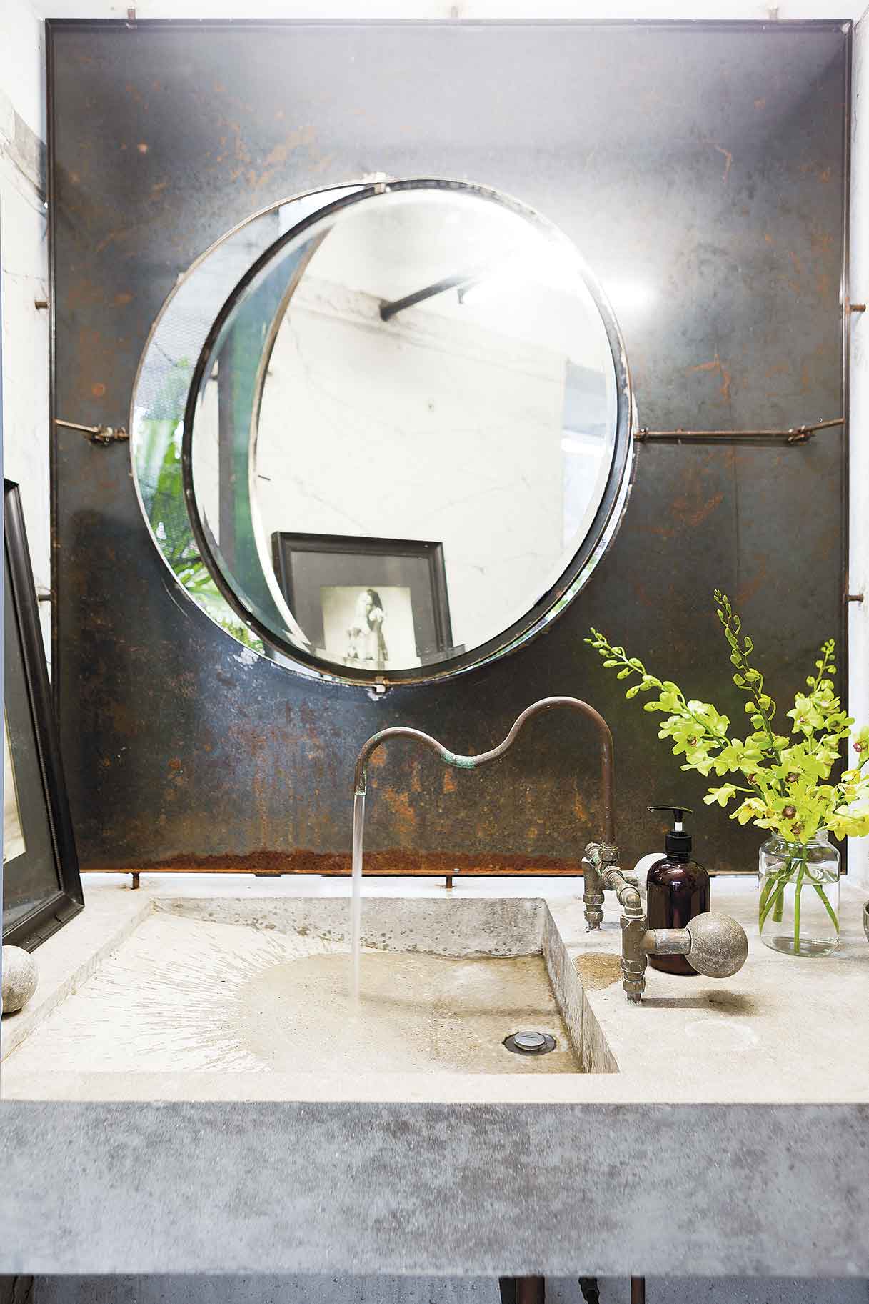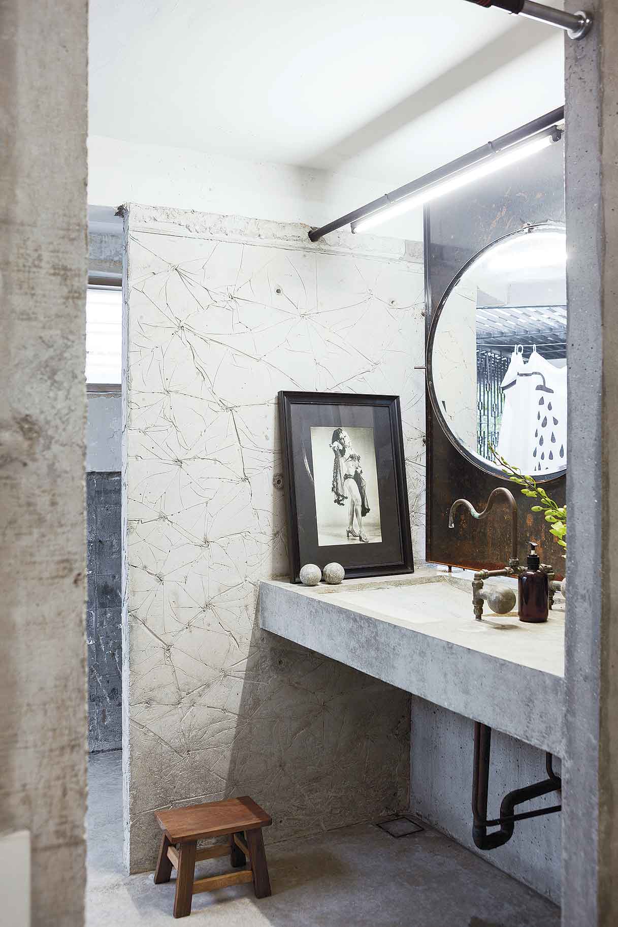 อีกหนึ่งห้องน้ำเท่ๆสไตล์ลอฟต์ที่โชว์พื้นผิวคอนกรีตร่วมกับการออกแบบก๊อกน้ำและระบบท่อแบบเปลือย เพิ่มลูกเล่นด้วยกระจกกลมที่สามารถปรับมุมมองและเปิดออกเป็นหน้าต่างที่มองเห็นภายนอกได้