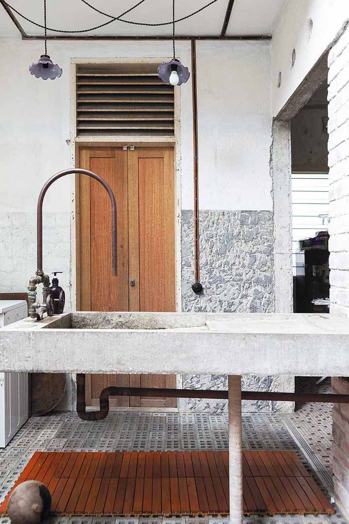 ส่วนมุมหน้าห้องน้ำชั้นล่างหล่อคอนกรีตเปลือยผิวให้เป็นอ่างล้างมือแนวยาว เพิ่มรายละเอียดเท่ๆแบบลอฟต์ด้วยการออกแบบก๊อกน้ำและระบบท่อแบบเปลือย