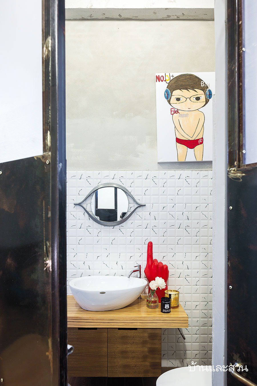 พื้นที่รูปทรงสี่เหลี่ยมผืนผ้าภายในบ้านเน้นการเปิดโล่งแบบสตูดิโอ โดดเด่นด้วยงานตกแต่งสไตล์อินดัสเทรียลลอฟต์ตั้งแต่ผนังปูนขัดมัน (บางส่วน) ฝ้าเพดานที่ยกสูงถึง 3.60 เมตร การโชว์แนวเดินท่อสายไฟ โคมไฟเพดานแบบอินดัสเทรียล และการเลือกใช้เหล็กมาเป็นวัสดุตกแต่งรวมถึงเฟอร์นิเจอร์บางส่วน โดยผสมผสานไปกับงานไม้ เพื่อเติมสัมผัสที่อบอุ่นของความเป็นบ้านให้มากขึ้น “เพราะพื้นที่มันเล็กก็เลยต้องดันเพดานให้สูงโปร่ง แล้ววางแผนก่อนเลยว่าจะมีพื้นที่อะไรในบ้านบ้าง อุ้มแต่งคล้ายๆ ห้องชุดในคอนโด คือใช้เฟอร์นิเจอร์ลอยตัวกำหนดฟังก์ชันของแต่ละมุม และไม่ทำบิลท์อินเลย เพื่อให้ง่ายต่อการเคลื่อนย้ายเปลี่ยนมุม หลายๆ ชิ้นออกแบบสั่งทำขึ้นมาใหม่ บางชิ้นก็เอาของเก่าที่มีมาปรับโฉม ผสมกับของใหม่ที่ดูเก่าหน่อยเพื่อให้กลมกลืนกันไป” อ่านต่อ