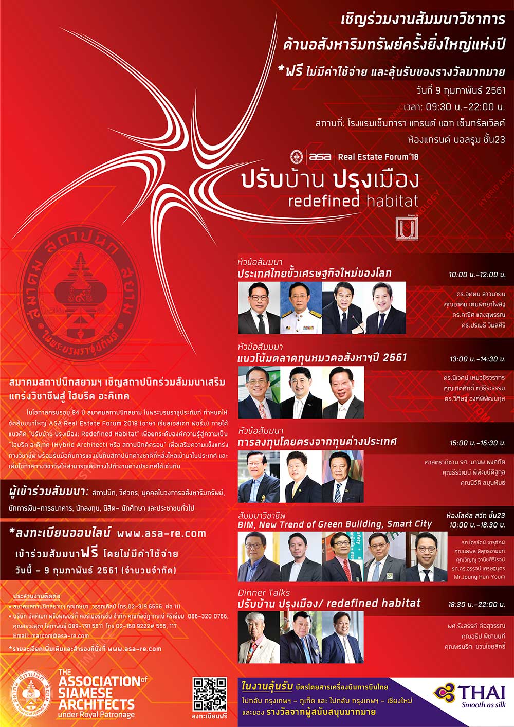 ในโอกาสครบรอบ 84 ปี สมาคมสถาปนิกสยาม ในพระบรมราชูปถัมภ์ ร่วมกับ บริษัท อัลติเมท พร๊อพเพอร์ตี้ คอร์เปอเรชั่น จำกัด (UPC) กำหนดจัดงานสัมมนาใหญ่ “ASA Real Estate Forum 2018” (อาษา เรียล เอสเตท ฟอรั่ม) ภายใต้แนวคิด “ปรับบ้าน ปรุงเมือง: Redefined Habitat” ในวันที่ 9 กุมภาพันธ์ 2561 ณ ห้อง World Ballroom โรงแรม เซ็นทารา แกรนด์ แอท เซ็นทรัลเวิลด์ เพื่อเป็นเวทีแลกเปลี่ยนความคิดแบบบูรณาการ และประสานเครือข่ายทางวิชาการจากผู้ทรงคุณวุฒิที่เกี่ยวข้องกับภาคธุรกิจอสังหาริมทรัพย์ เพื่อร่วมกันยกระดับองค์ความรู้ให้แก่สถาปนิก วิศวกร และผู้ประกอบการอสังหาริมทรัพย์ไทยสู่มาตรฐานสากล