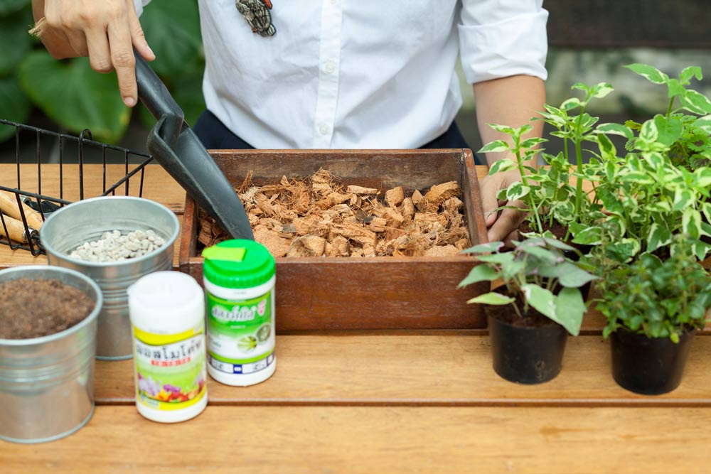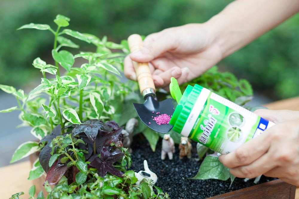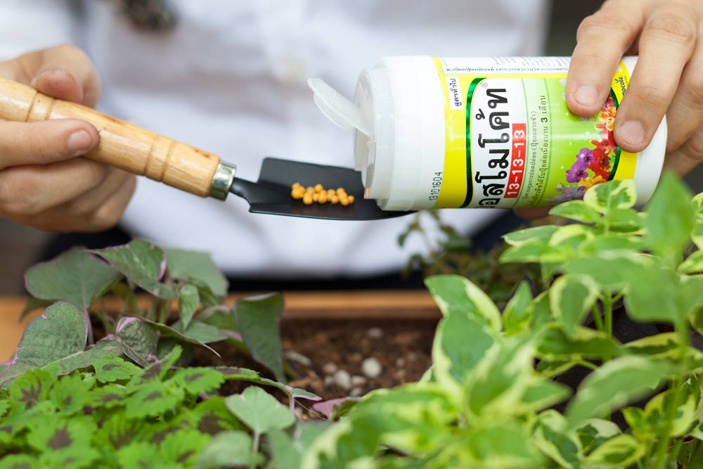 4.ใส่ปุ๋ยออสโมโค้ท สูตร 13-13-13 รอบๆโคนต้น เพื่อให้ต้นไม้ในกระถางเติบโตสวยงาม ได้รับธาตุอาหารอย่างสม่ำเสมอและต่อเนื่องในปริมาณที่พอเหมาะ