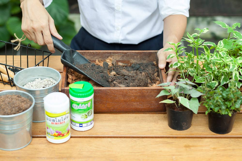 2.ใส่ดินผสมปลูกต้นไม้ลงไป จากนั้นจึงใส่หินภูเขาไฟ คลุกเคล้าให้เข้ากันเพื่อให้เครื่องปลูกโปร่ง