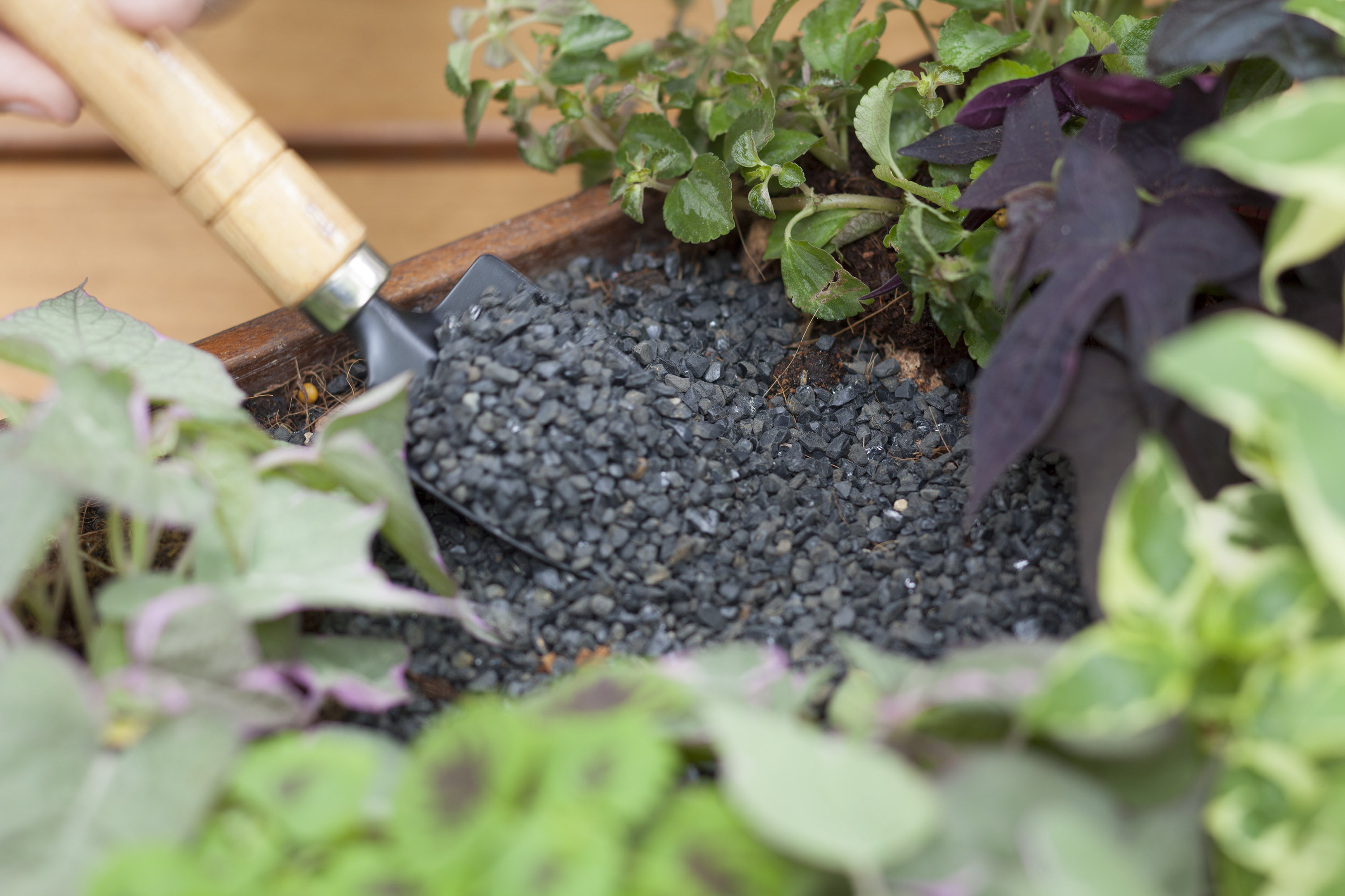 5.โรยกรวดตกแต่งผิวดินให้เรียบร้อย จากนั้นรดน้ำทันที โดยรดให้ชุ่มจนกระทั่งน้ำระบายออกมาทางก้นกระบะ