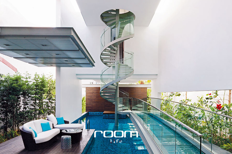 บันไดวนคือบันไดที่มีรัศมีวงในแคบและมีความชันสูง แต่หากเพิ่มการดีไซน์และการเลือกวัสดุเข้าไปอีกนิด จากเดิมท่ีมักใช้เป็นบันไดชอร์ตคัตก็สามารถเป็นงานประติมากรรมสวย ๆ ให้บ้านของคุณได้ อย่างการทําบันไดวนกลางบ้านขึ้นมาจากสระว่ายน้ําพันเกลียวอยู่รอบเสาคอนกรีตเสริมเหล็กที่เป็นโครงสร้างหลัก แม่บันได ขั้นบันได และราวจับทําจากสเตนเลส ปิดท้ายด้วยการใช้กระจกทําลูกราวบันไดแบบปิด แนะนําให้ใช้แผ่น กระจกหนา 12 มิลลิเมตร และเว้นรอยต่อระหว่างกระจก 5-10 มิลลิเมตร เดิมทีนิยมสร้างข้ึนสําหรับบ้านท่ีมีพื้นที่คับแคบ แต่ถ้าต้องการสร้างบันไดชนิดน้ีจริง ๆ อย่าลืมคํานึงเรื่องผู้สูงอายุในบ้านด้วย เพราะบันไดชนิดนี้จะไม่มีชานพักและค่อนข้างชัน
