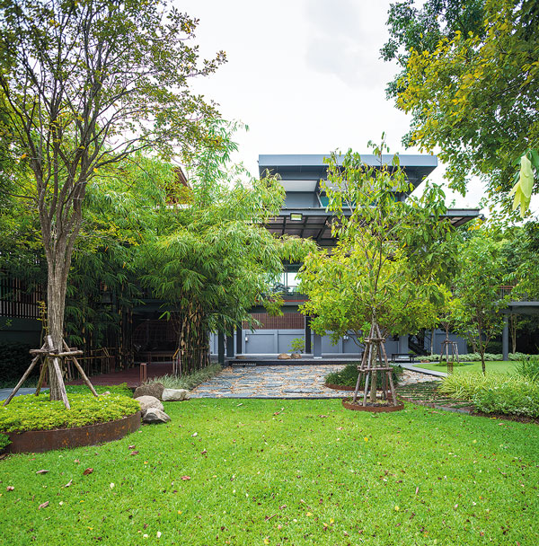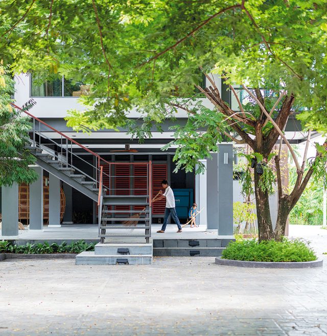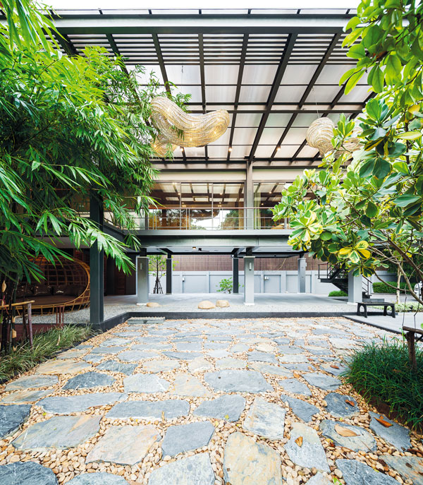 คุณกึ๋น-กศินร์ ศรศรี แห่ง Volume Matrix Studio สถาปนิกผู้ออกแบบ เล่าถึงโจทย์อีกข้อที่ได้รับในการออกแบบบ้านซึ่งเป็นเหมือนส่วนต่อขยายจากบ้านใหญ่ รูปแบบบ้านนั้นมีความเป็นบ้านไทยอย่างชัดเจน มีกลิ่นอายของเรือนไทยในอยุธยาซึ่งมีใต้ถุนสูง เพื่อใช้เป็นลานอเนกประสงค์ มีชายคายื่นยาวพร้อมพื้นที่นั่งเล่นรับลมนอกบ้าน ตัวบ้านถูกยกลอยเพื่อให้มองเห็นวิวแม่น้ำ พร้อมกับชมวิวสวนด้านล่าง และยังมีระเบียงที่ต่อมาจากบ้านหลังใหญ่ด้วย เสาและคานขนาดใหญ่ออกแบบให้โชว์การใช้สอยอย่างกลมกลืนเป็นส่วนหนึ่งของบ้าน อาทิ เป็นขั้นบันไดก่อนเข้าห้องรับประทานอาหาร หรือเป็นทางเดิน พื้นนอกชาน และช่องระบายน้ำซึ่งได้จากตะแกรงเหล็ก จนกลายเป็นบ้านโครงสร้างเหล็กที่ผสมผสานกับไม้ที่ดูร่วมสมัยได้อย่างลงตัว