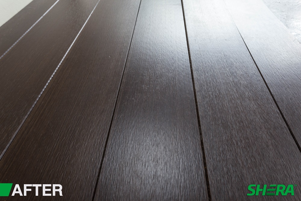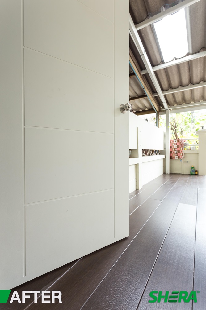 มาต่อกันในส่วนของพื้นที่หน้าบ้านจากภาพเดิมของพื้นที่หน้าบ้านที่มีปัญหาน้ำรั่วซึม และมีความชื้นค่อนข้างมาก ได้รับการปรับเปลี่ยนด้วยการยกระดับพื้นให้สูงจากพื้นคอนกรีตเดิม เพิ่มความสวยงามและความหลากหลาย มีการแบ่งสัดส่วนพื้นที่ 1 ใน 4 ด้วยการปูไม้พื้น เฌอร่า คัลเลอร์ทรู (SHERA Color Through) สีในเนื้อ ตามแนวยาวให้ดูสวยงาม ให้ความอบอุ่นเสมือนใช้ไม้จริง ด้วยเทคโนโลยีการผสมสีในเนื้อวัสดุด้วยนาโน พิกเมนต์ จึงทำให้สีเนื้อไม้สวยจากภายในถึงภายนอก มีความแข็งแรง ทนทาน และไม่มีปัญหาเรื่องความชื้น สามารถใช้เป็นพื้นที่ซักล้าง แม้โดนน้ำมากขนาดไหนก็ไม่โก่งบวม อีกทั้งทำความสะอาดง่าย