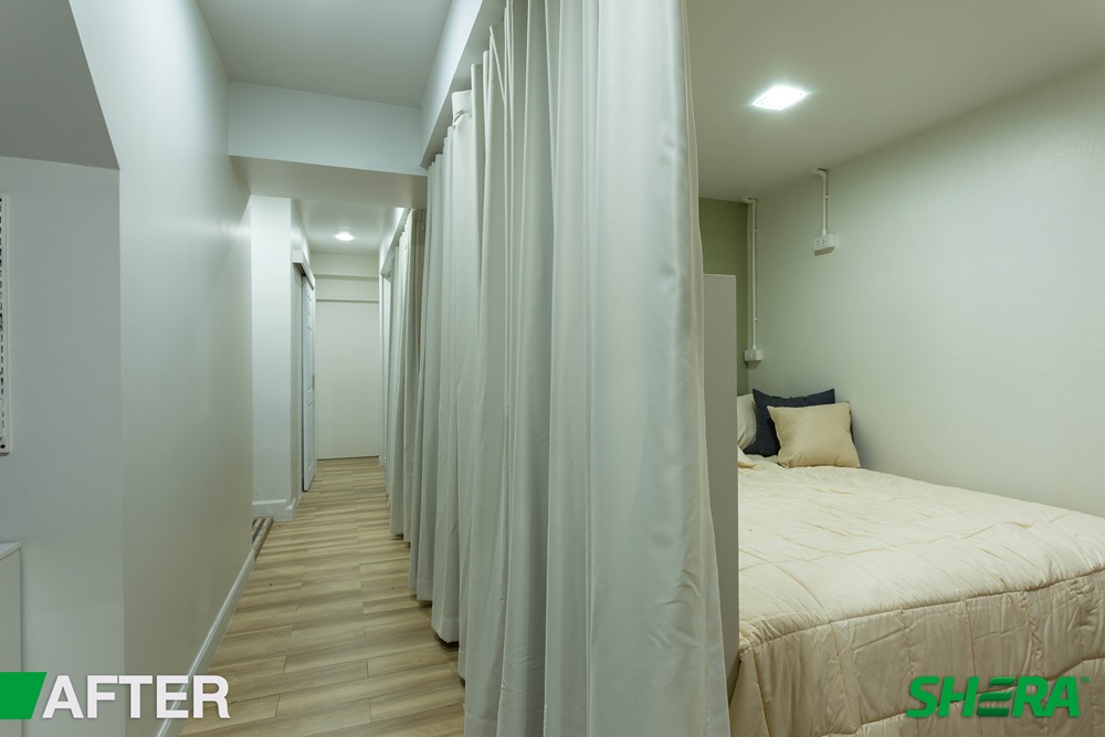 ส่วนที่นอนของคุณพ่อได้ทำการย้ายจากใต้บันไดมาไว้พื้นที่ฝั่งตรงข้ามที่เคยใช้งานไม่ได้ เมื่อปรับปรุงแล้วนอกจากจะเป็นห้องพักผ่อนที่เหมาะสมยังเป็นพื้นที่ทำงานไปในตัว โดยได้ติดตั้งโต๊ะทำงานแบบบานพับ พร้อมตู้เก็บของที่สามารถจัดเก็บเครื่องมือทำงานของคุณพ่อให้เป็นสัดส่วน พร้อมติดผ้าม่านสำหรับเลื่อนเปิด-ปิด เมื่อต้องการความเป็นส่วนตัว รวมถึงจัดเก็บให้เป็นระเบียบด้วยการติดตั้งตู้ลิ้นชักขนาดใหญ่ พร้อมปรับพื้นที่ใต้บันไดให้เป็นห้องทำงานของคุณลภัสรดา ซึ่งจุดนี้ได้ติดตั้งชั้นวางของแบบลอยตัวสำหรับเก็บ สต๊อกสินค้าเอาไว้ขายอีกด้วย