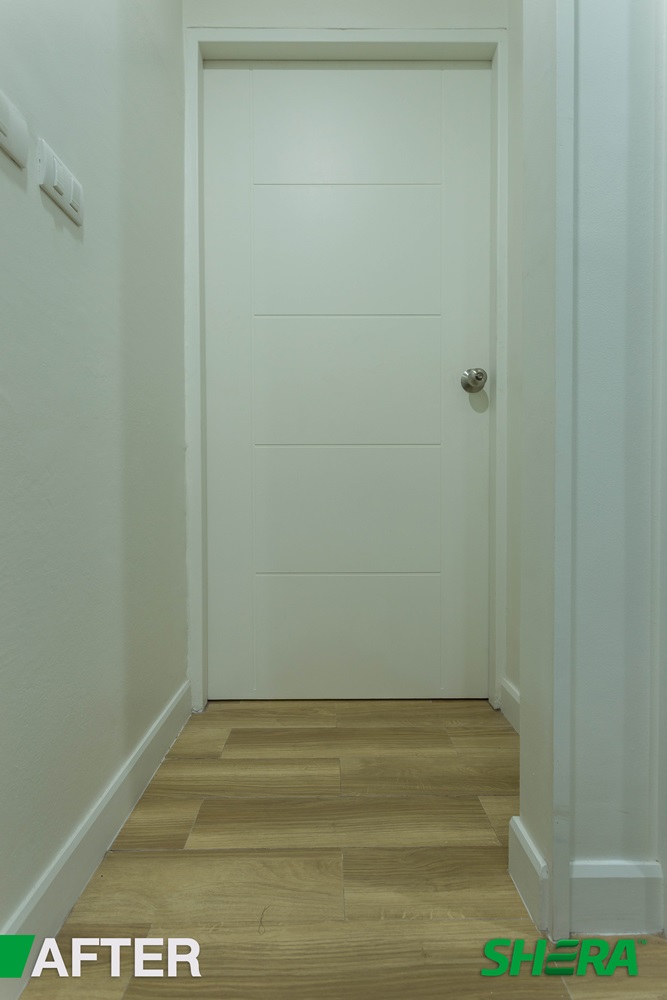 นอกจากการปรับพื้นที่ภายในบ้านแล้วก็ได้ทำการเปลี่ยนประตูเข้าสู่บ้านใหม่ จากเหล็กดัดที่ขึ้นสนิมและเริ่มเปิดปิดยาก เป็น ประตูและวงกบประตู เฌอร่า ที่แข็งแรงทนทานกว่าประตูและวงกบประตูทั่วไป ทนน้ำ ทนชื้น ทนแดดได้ดี เหมาะต่อการใช้งานทั้งนอกบ้านและในบ้าน ซึ่งวงกบประตูก็สามารถติดตั้งได้ง่าย ไม่พุบวมเหมือนวงกบไม้ทั่วไป นอกจากนี้ประตูภายในบ้านก็เปลี่ยนใหม่ทั้งหมด เพื่อความทนทานต่อปลวก ด้วยการวางใจใช้ประตู เฌอร่า ที่ใช้งานได้ยาวนาน เปิดปิดได้ง่าย ปลอดภัยต่อผู้สูงอายุ มีดีไซน์สวยงาม เข้ากับตัวบ้านที่ตกแต่งใหม่ในโทนสีขาว สะอาดตาได้เป็นอย่างดี
