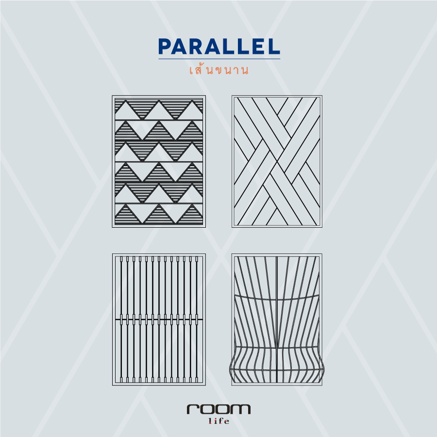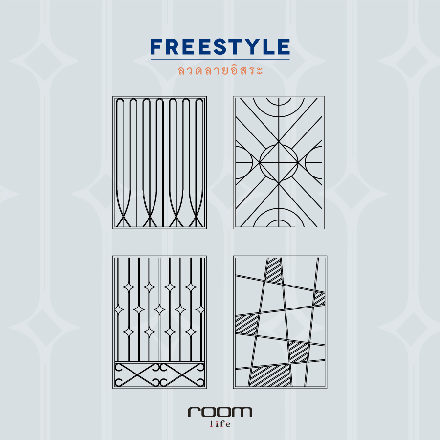 ลายพื้นฐานที่ติดตั้งอย่างไรก็ไม่พลาด เพราะเข้ากับบ้านได้ทุกรูปแบบ ไม่ว่าจะเป็นเส้นตรงหรือเส้นโค้ง เส้นแนวตั้งหรือแนวนอนออกแบบให้เรียงขนานกันไปในระยะห่างที่เท่า ๆ กัน อาจเพิ่มลูกเล่นอีกนิดด้วยปมเกาะบนเส้น หรือการใช้เส้นตรงที่ออกแบบให้ปลายล่างโค้งออกแล้วงุ้มเข้า (Belly) แล้วใส่กระถางปลูกต้นไม้เล็ก ๆ ก็ดูน่ารักสดใสดี ทั้งนี้ระยะห่างระหว่างเหล็กแต่ละเส้นควรสัมพันธ์กับสัดส่วนของกรอบหน้าต่างและขนาดของเส้นเหล็กด้วย