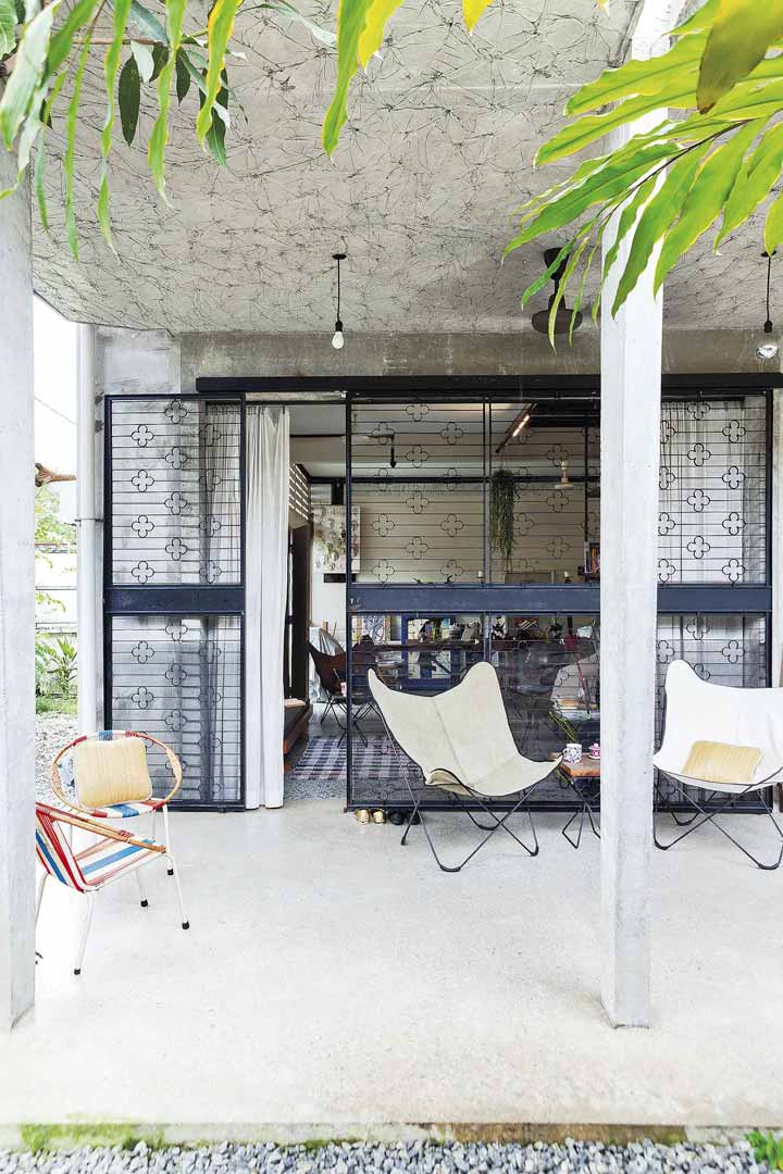 เติมลูกเล่นให้ลายเหล็กดัดแบบเส้นขนาน ด้วยการแทรกลวดลายเรขาคณิตเข้าไประหว่างเส้น เหล็กดัดชิ้นนี้เป็นการนำรั้วเหล็กดัดเดิมที่เคยอยู่รอบบ้านมาประยุกต์เป็นประตู บานเลื่อนดีไซน์เก๋อีกด้วย