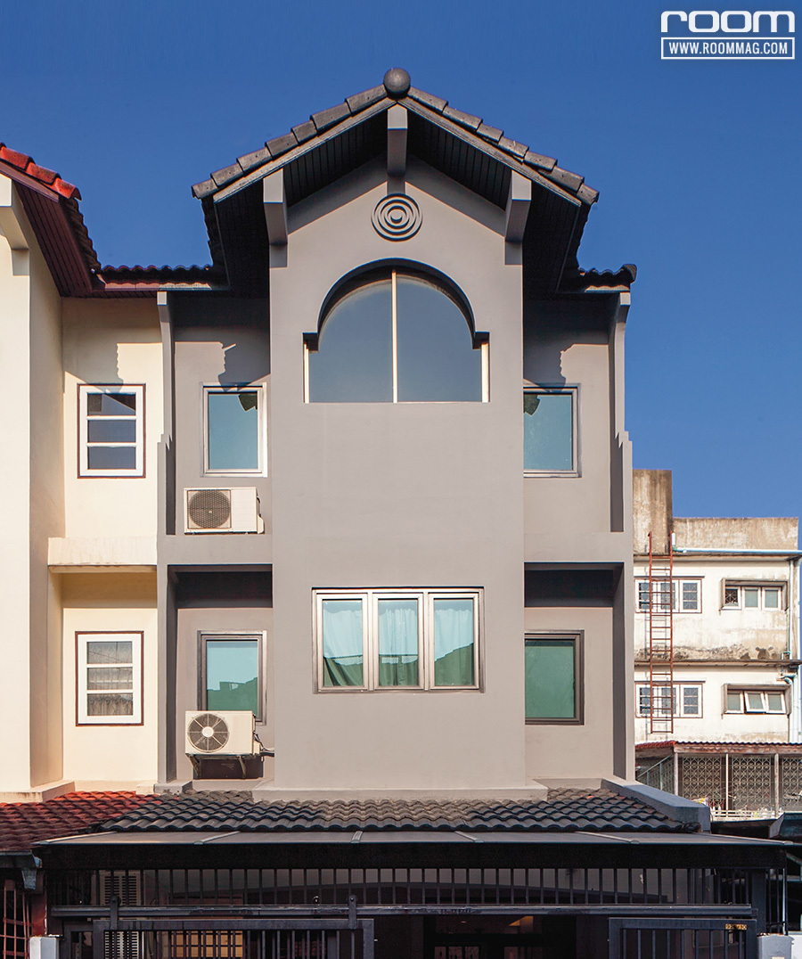 “เรามีเวลาจํากัดในการทําบ้าน เพราะกําหนดวันแต่งวันเข้าเรียบร้อยแล้ว จึงพยายามไม่แตะต้องโครงสร้างภายนอกมากนัก แต่ก็ยังอยากให้ดูโมเดิร์นอยู่สักหน่อย จึงใช้วิธีง่ายๆ ด้วยการทาสีใหม่ โดยเลือกสีให้ได้ลุคที่ใช่และแตกต่าง ประกอบกับเราได้ทุบระเบียงชั้น 2 และ 3 ออก โครงสร้างอาคารด้านนอกจึงมีความเรียบเนียนดูโมเดิร์นไปในตัว”