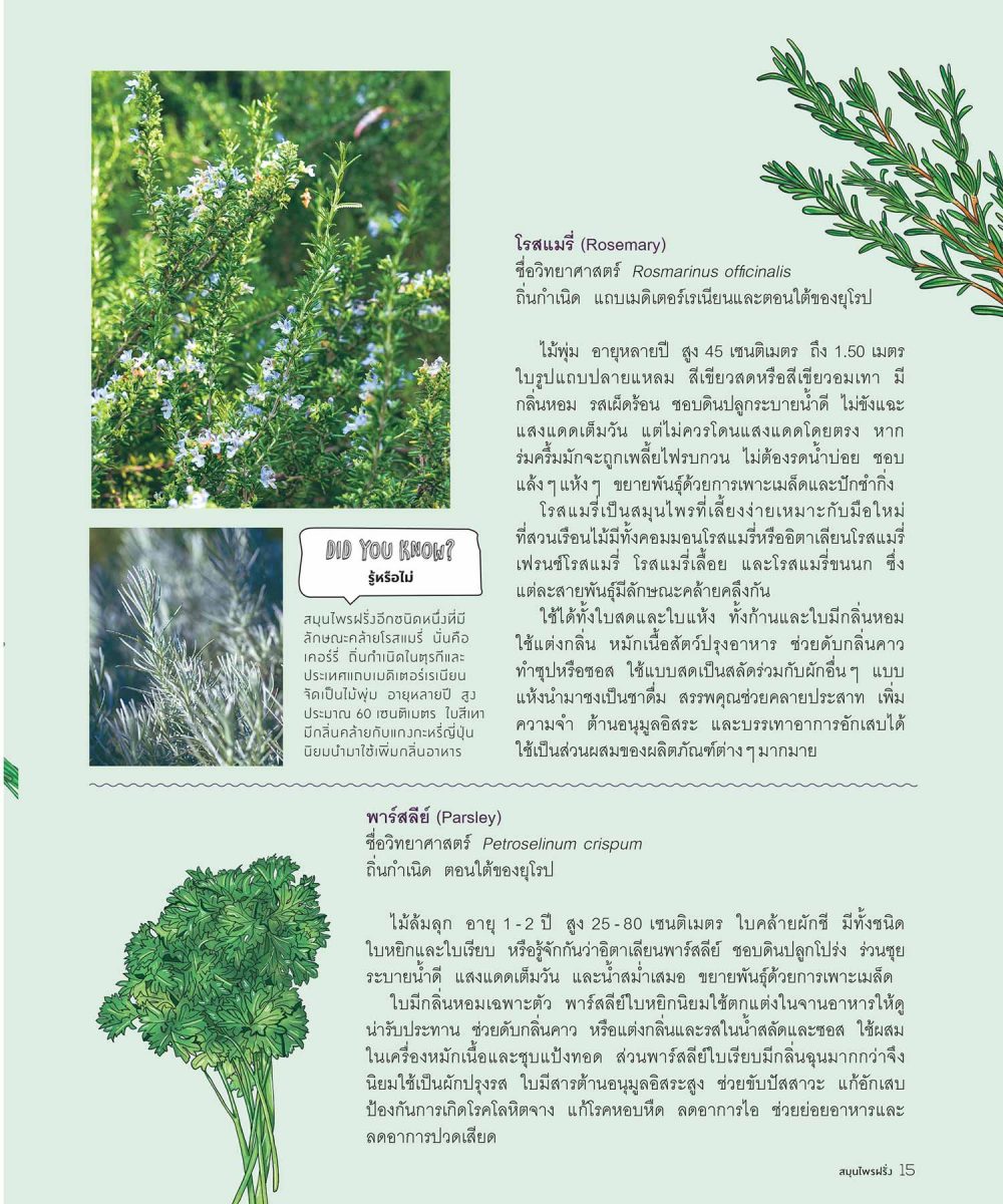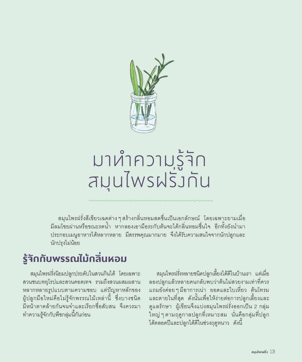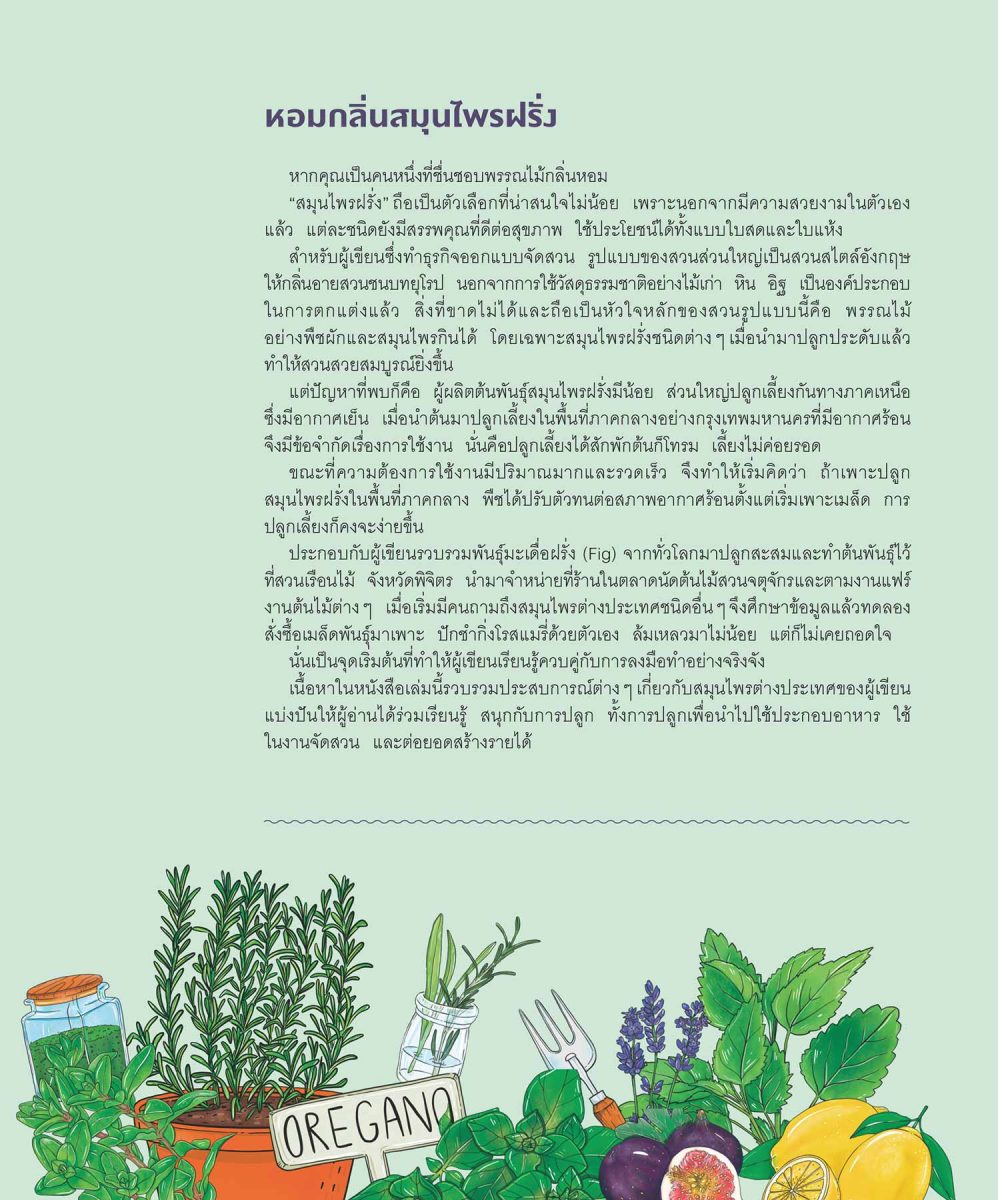 รวมเรื่องราวการปลูก สมุนไพรฝรั่ง เช่น โรสแมรี่ ไธม์ ออริกาโน เลมอนบาล์ม เสจ เบย์ลีฟ ลาเวนเดอร์ มินต์ สวีทเบซิล พาสลีย์ ฯลฯ รวมถึงไม้ผลในกระถางอย่างมะนาวต่างประเทศ (เลมอน) และมะเดื่อฝรั่ง ซึ่งนิยมปลูกเป็นไม้ประดับ