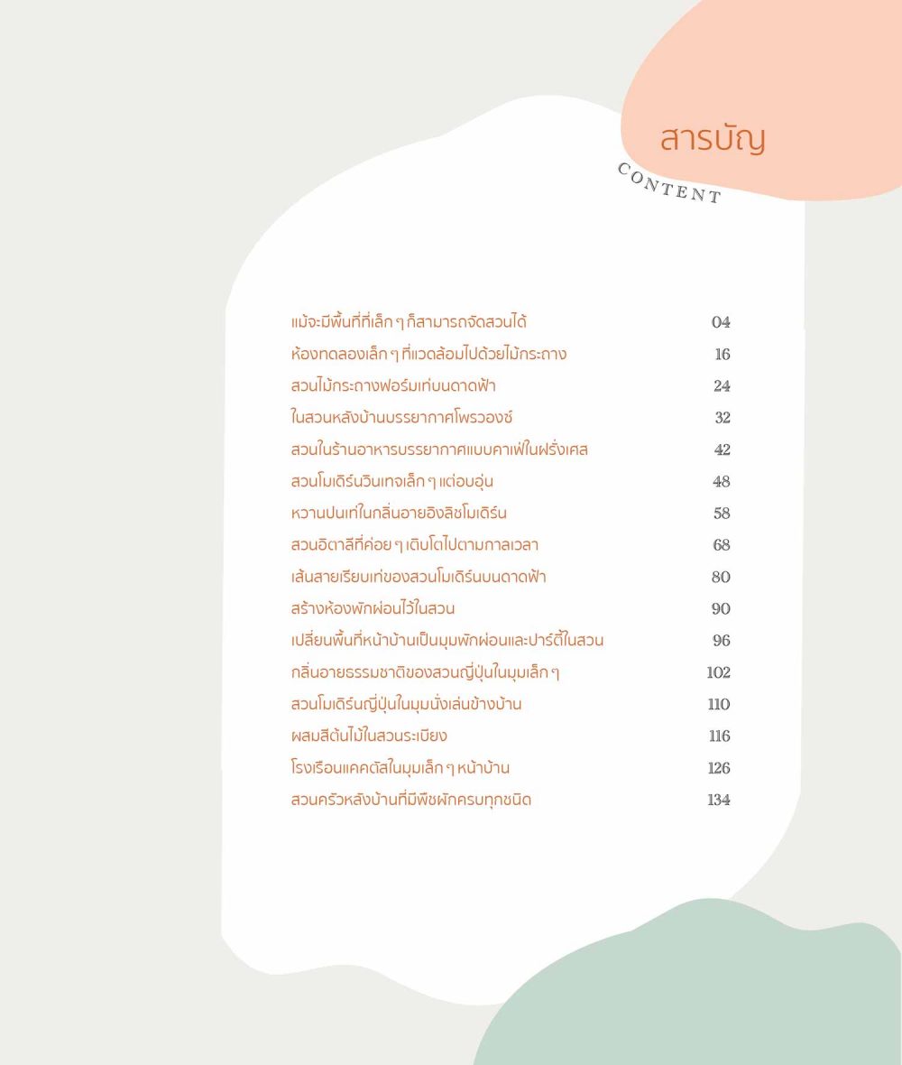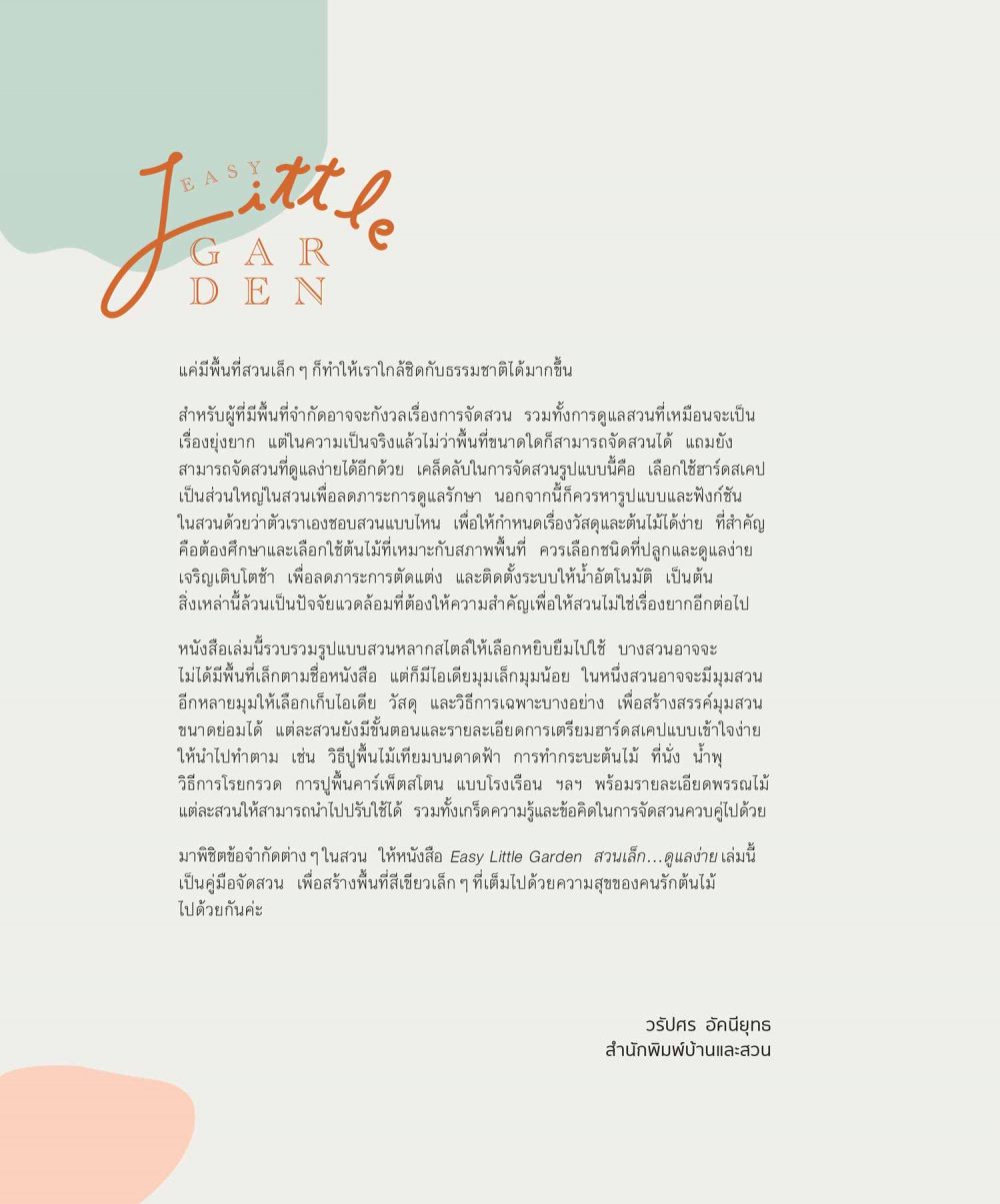 การจัดสวนขนาดเล็กไม่ใช่เรื่องยากแต่การจัดสวนเพื่อให้ดูแลง่ายด้วยนั้นก็มีข้อควรใส่ใจ เคล็ดลับในการจัดสวนรูปแบบนี้คือเลือกใช้ฮาร์ดสเคปเป็นส่วนใหญ่เพื่อลดภาระการดูแลรักษา หนังสือเล่มนี้รวบรวมรูปแบบสวนหลากสไตล์ให้เลือกหยิบยืมไปใช้ บางสวนอาจจะไม่มีได้มีพื้นที่เล็กตามชื่อหนังสือแต่ก็มีไอเดียมุมเล็กมุมน้อย ในหนึ่งสวนอาจจะมีอีกหลายมุมให้เลือกเก็บไอเดียไปใช้ แต่ละสวนยังมีขั้นตอนและรายละเอียดการเตรียมฮาร์ดสเคปแบบเข้าใจง่ายให้นำไปทำตาม เช่น วิธีปูพื้นไม้เทียมบนดาดฟ้า การทำกระบะต้นไม้ ที่นั่ง น้ำพุ พื้นกรวด การปูพื้นคาร์เป็ตสโตน แบบโรงเรือนต้นไม้ ฯลฯ พร้อมรายละเอียดพรรณไม้ให้นำไปปรับใช้ รวมทั้งเกร็ดความรู้ และข้อคิดในการจัดสวนควบคู่ไปด้วย