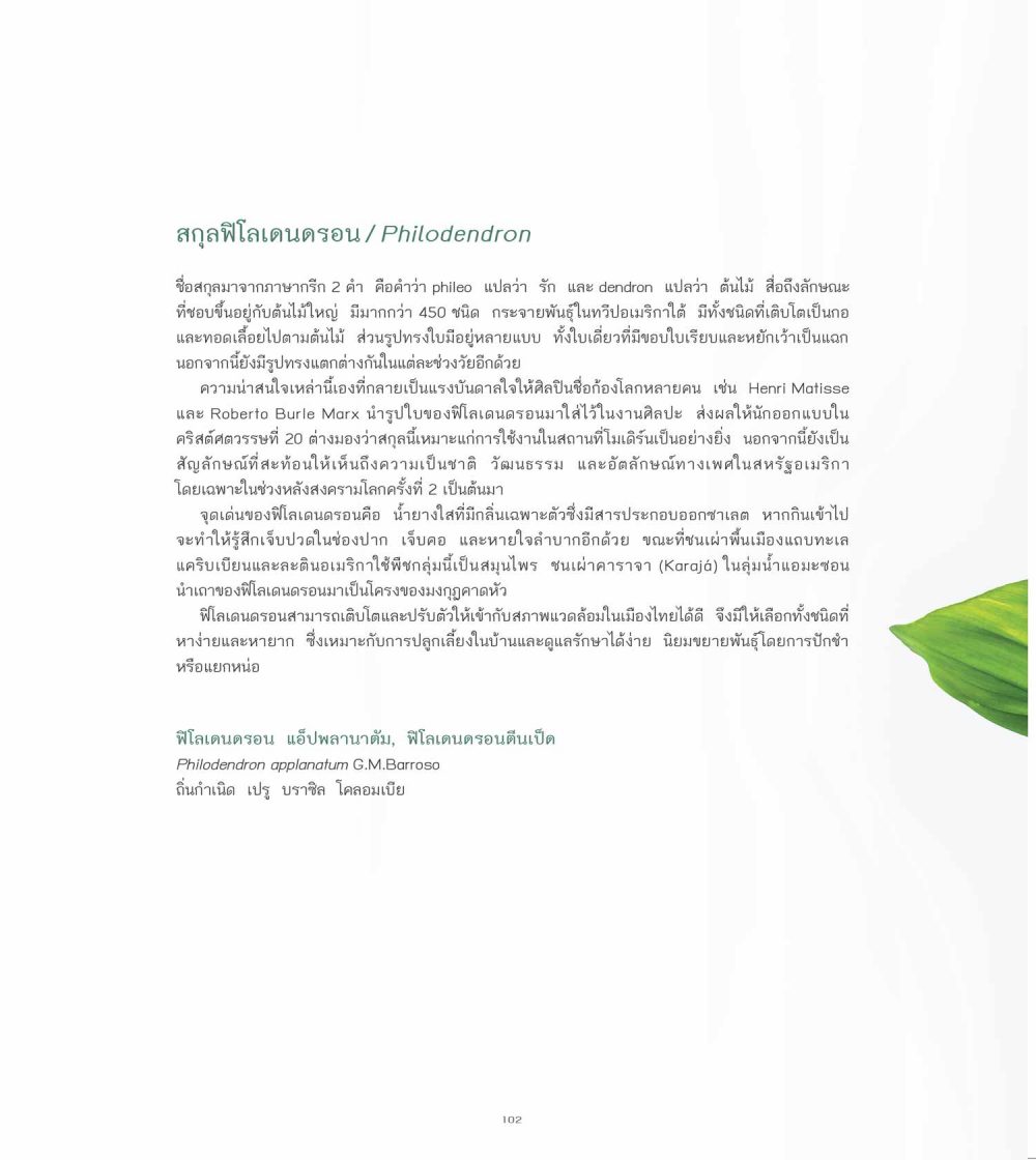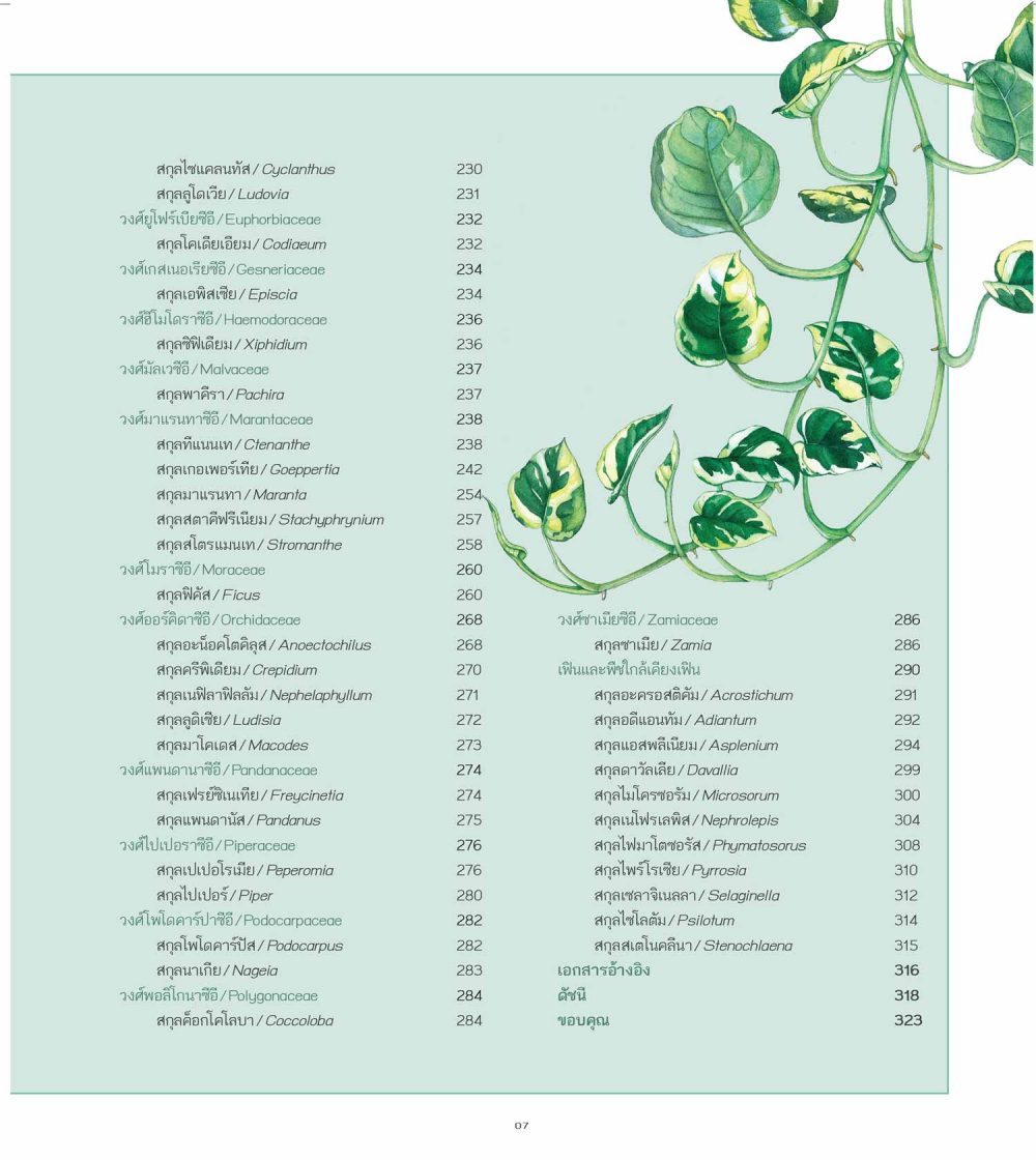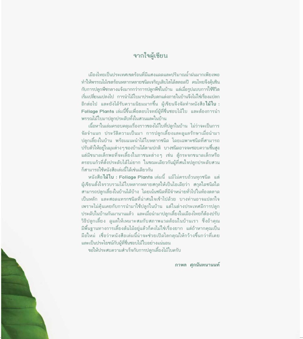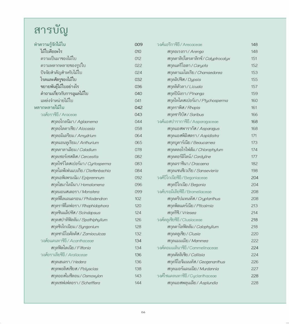 รวมเรื่องราวของไม้ใบตั้งแต่ประวัติความเป็นมา การจำแนก ดูแลรักษา ขยายพันธุ์ ประโยชน์ของไม้ใบในด้านไม้ประดับ ทั้งภายในบ้านและนอกบ้าน และรวบรวมพันธุ์ไม้ใบที่นิยมกันในตลาดต้นไม้ พร้อมสอดแทรกเกร็ดความรู้ที่มาและเทคนิคการปลูกเลี้ยง รวมมากกว่า 500 ชนิด/ พันธุ์