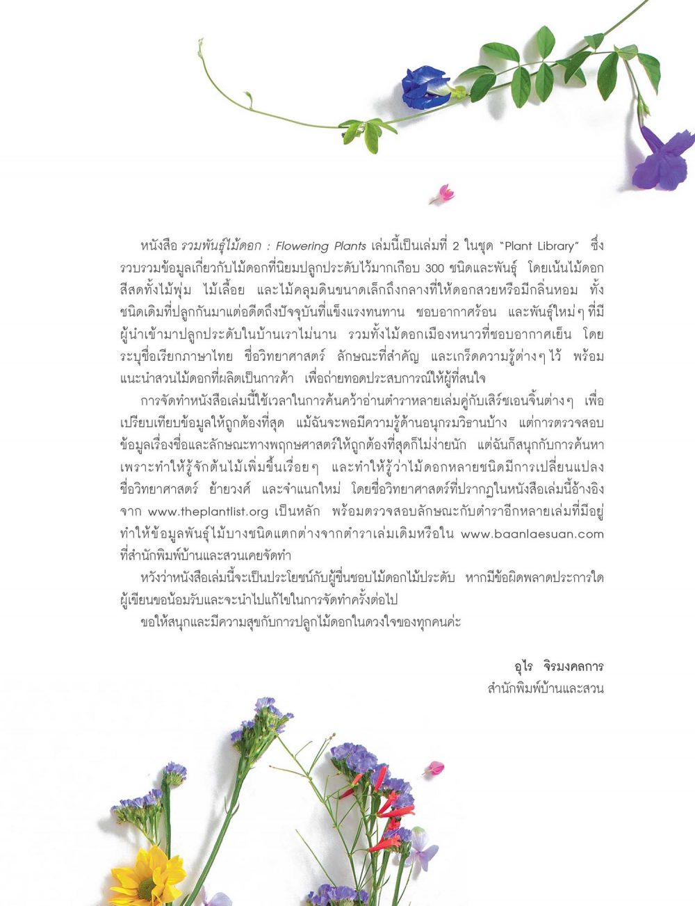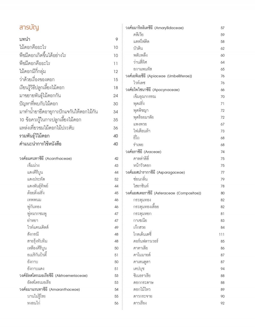 ทุกคนต่างมีดอกไม้ที่รักในดวงใจ แต่จะทำอย่างไรที่จะดูแลต้นไม้ดอกไม้ที่รักเหล่านั้นเติบโต สวยงาม และได้ต้นใหม่ที่ให้ดอกบานสะพรั่งดังหวัง มาเรียนรู้ไม้ดอกกับหนังสือ “รวมพันธุ์ไม้ดอก” ที่รวบรวมไม้ดอกไว้มากกว่า 300 ชนิดและพันธุ์ที่ปลูกเลี้ยงได้ในบ้านเรา พร้อมเรื่องราวจากประสบการณ์ของผู้ปลูกเลี้ยงไม้ดอกประดับ เพื่อสร้างแรงบันดาลใจให้กับทุกท่านที่หลงรักไม้ดอก ขอให้มีความสุขและสนุกกับการปลูกไม้ดอกกันนะคะ