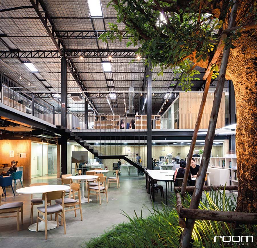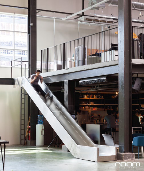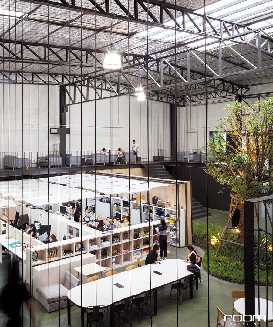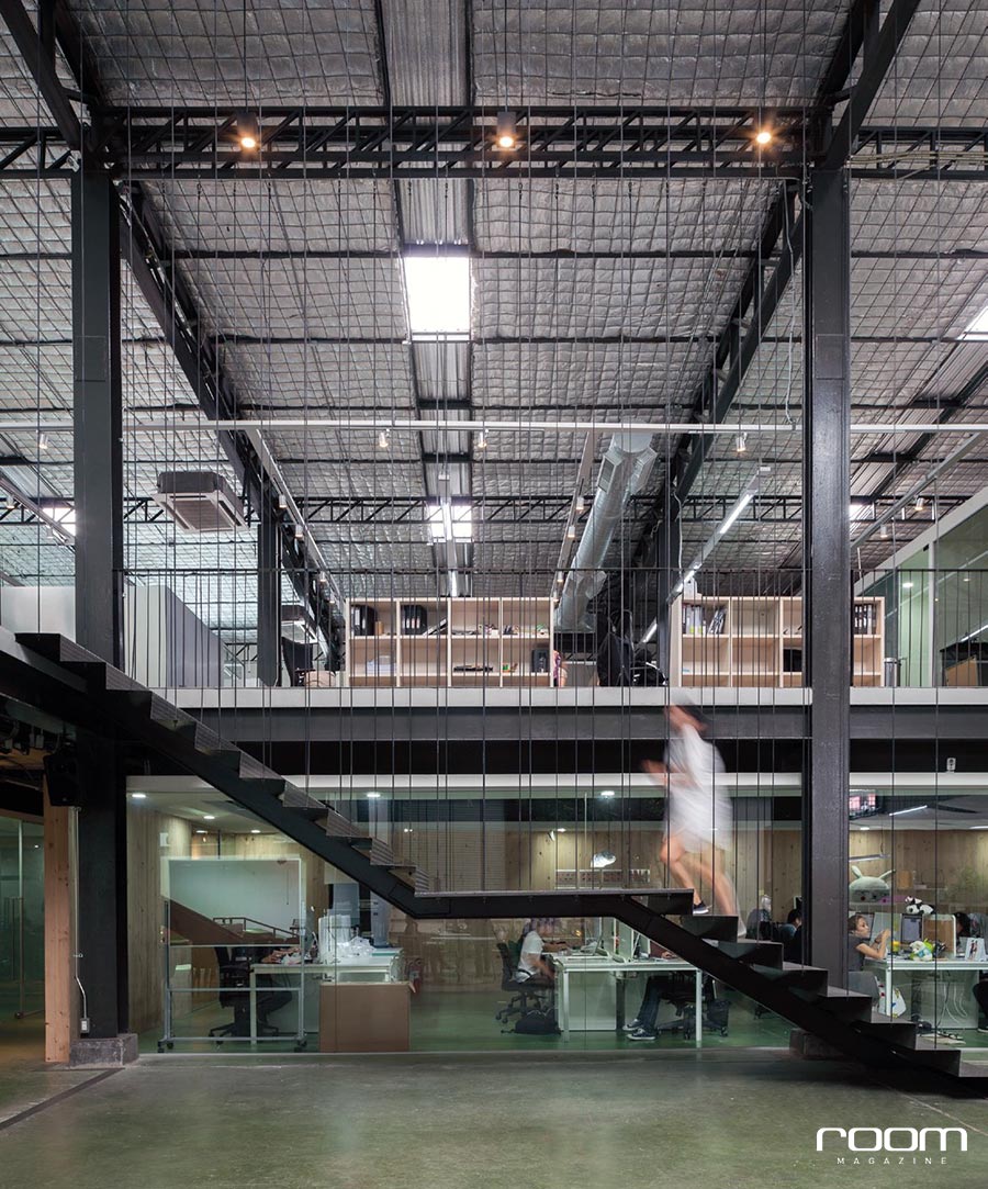 บ้านโครงสร้างเหล็ก ทรงกล่องที่เรียบง่าย บางส่วนมีลูกเล่นเป็นผนังปูน อาทิ ผนังปูนที่ติดกับสนามใช้บังที่จอดรถเป็นคอนกรีตที่กะเทาะผิวหน้าให้ขรุขระ