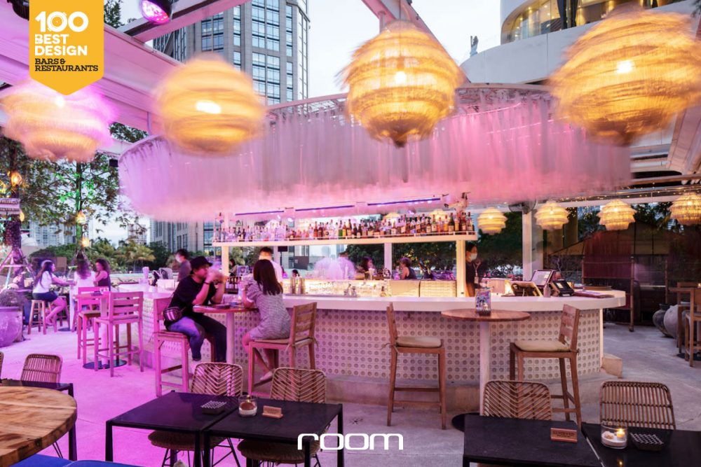 บาร์ค็อกเทลขนาดใหญ่สีขาวทรงโค้งมน ช่วยให้บาร์เทนเดอร์สามารถบริการลูกค้าที่นั่งอยู่บนสตูลได้รอบทิศทาง ด้านบนประดับเเชนเดอเลียร์ผ้าพลิ้วไหวราวกับฟองคลื่น เมื่อกระทบกับเเสงไฟนีออนสีชมพูฟลามิงโก