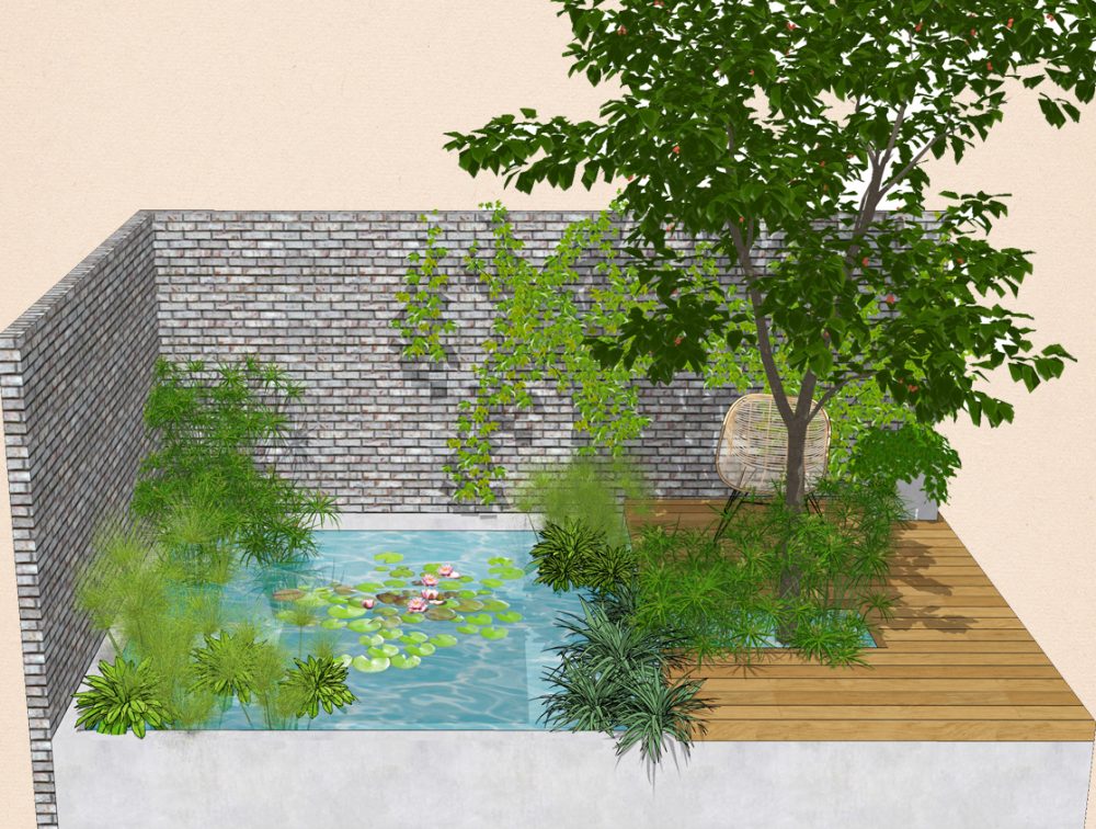 A. พื้นไม้เทียม ขนาด 2 x 3 x 0.1 เมตร B. เก้าอี้ C. กระถาง D. บ่อน้ำ ขนาด 5 x 3 x 0.5 เมตร