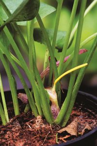 ลำต้น: สูงประมาณ 20 เซนติเมตร มีลำต้นใต้ดินคล้ายหัวเผือก รูปทรงกลมขนาดเล็ก