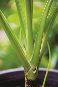 ดอก: ช่อดอกออกที่ซอกใบแบบช่อเชิงลดมีกาบ ใบประดับคล้ายกาบรองรับช่อดอกสีเขียว ปลีดอกสีขาวนวล