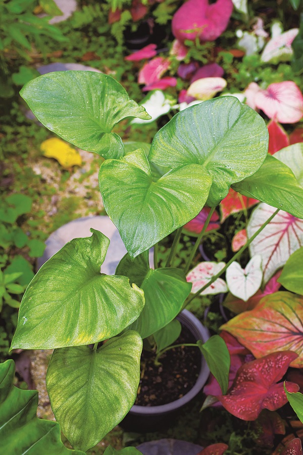 ใบ: ใบเดี่ยว เรียงเวียน รูปหัวใจ สีเขียว กาบใบสีเขียวมีขอบขาว