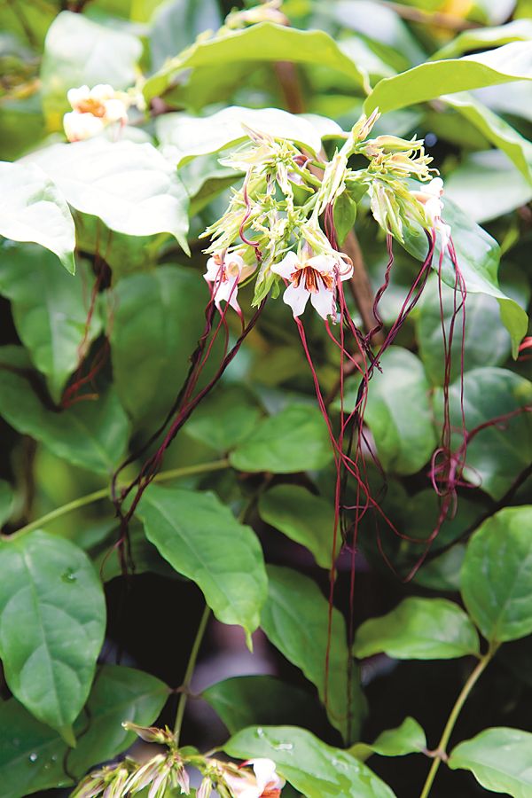 ดอก: ช่อดอกออกตามซอกใบและปลายกิ่ง ดอกย่อยเรียงตรงข้ามสลับตั้งฉาก มีก้านดอกยาว ดอกเล็ก สีขาวถึงชมพูจาง โคนกลีบเป็นหลอดสั้นๆ ปลายแยก 5 แฉก ด้านล่าง 3 แฉก ด้านบน 2 แฉก ติดกับเป็นรูปขอบขนาน ด้านนอกสีน้ำตาลแดงและมีขนสั้นๆ ปกคลุม เกสรเพศผู้มีก้านยาวและโค้งเข้าหากัน 1 คู่