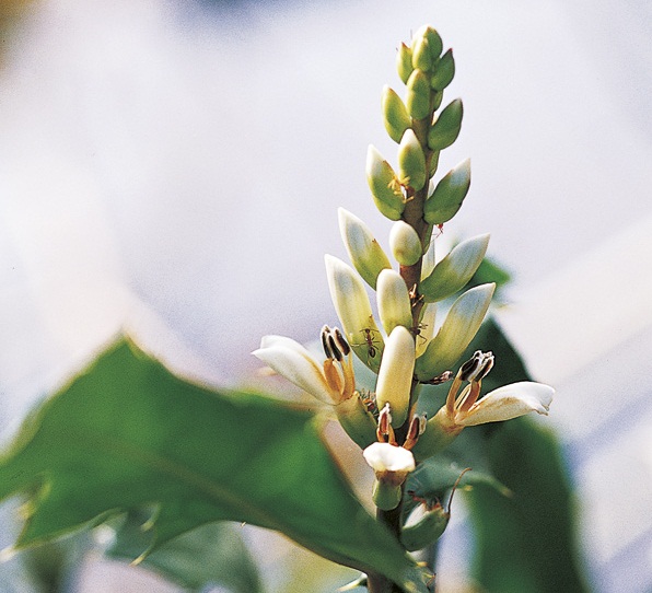 ดอก: ก้านช่อดอกยาว 10-30 ซม. ช่อดอกมี 4-5 ช่อหรือมากกว่า แต่ละช่อประกอบด้วยช่อย่อยอีกหลายช่อ มีดอกย่อยขนาดเล็กอยู่รอบๆ แกน สีน้ำตาลแดงหรือสีน้ำตาลอมม่วง