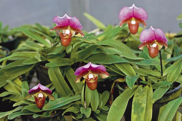 ดอก: ก้านดอกสีน้ำตาลเข้มชูขึ้นมาเหนือใบ ยาว 12 -15 เซนติเมตร แต่ละช่อมี 1 ดอก ดอกบานขนาดประมาณ 7 เซนติเมตร สีชมพูสด กระเป๋าสีน้ำตาลอมแดง กลีบบนกว้างแผ่ตึง ออกดอกเดือนสิงหาคม – ธันวาคม