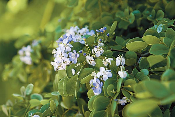 ดอก: ออกเป็นช่อกระจุกตามซอกใบใกล้ปลายยอด กลีบดอก 5 กลีบ ดอกบานมีเส้นผ่านศูนย์กลาง 2 – 2.5 เซนติเมตร บานวันแรกสีฟ้าอมม่วง จากนั้นสีจะซีดลงเป็นสีขาว เกสรสีเหลืองเห็นเด่นชัด มีกลิ่นหอมอ่อนๆ ออกดอกเดือนสิงหาคม – มกราคม