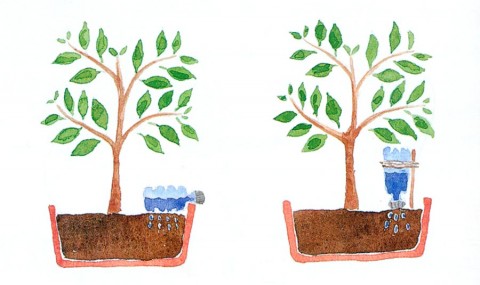♦ หาขวดน้ำพลาสติก เจาะรูข้างขวด ข้างหนึ่งเจาะ 2-5 รู อีกข้างเจาะ 5-10 รู แล้วใส่น้ำ วางโคนต้นไม้ ให้ด้านที่มีรูจำนวนมากสัมผัสกับผิวดิน น้ำจะค่อยๆ หยดลงมาที่น้อย
